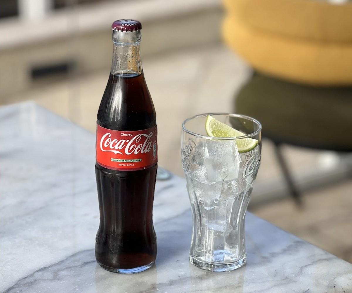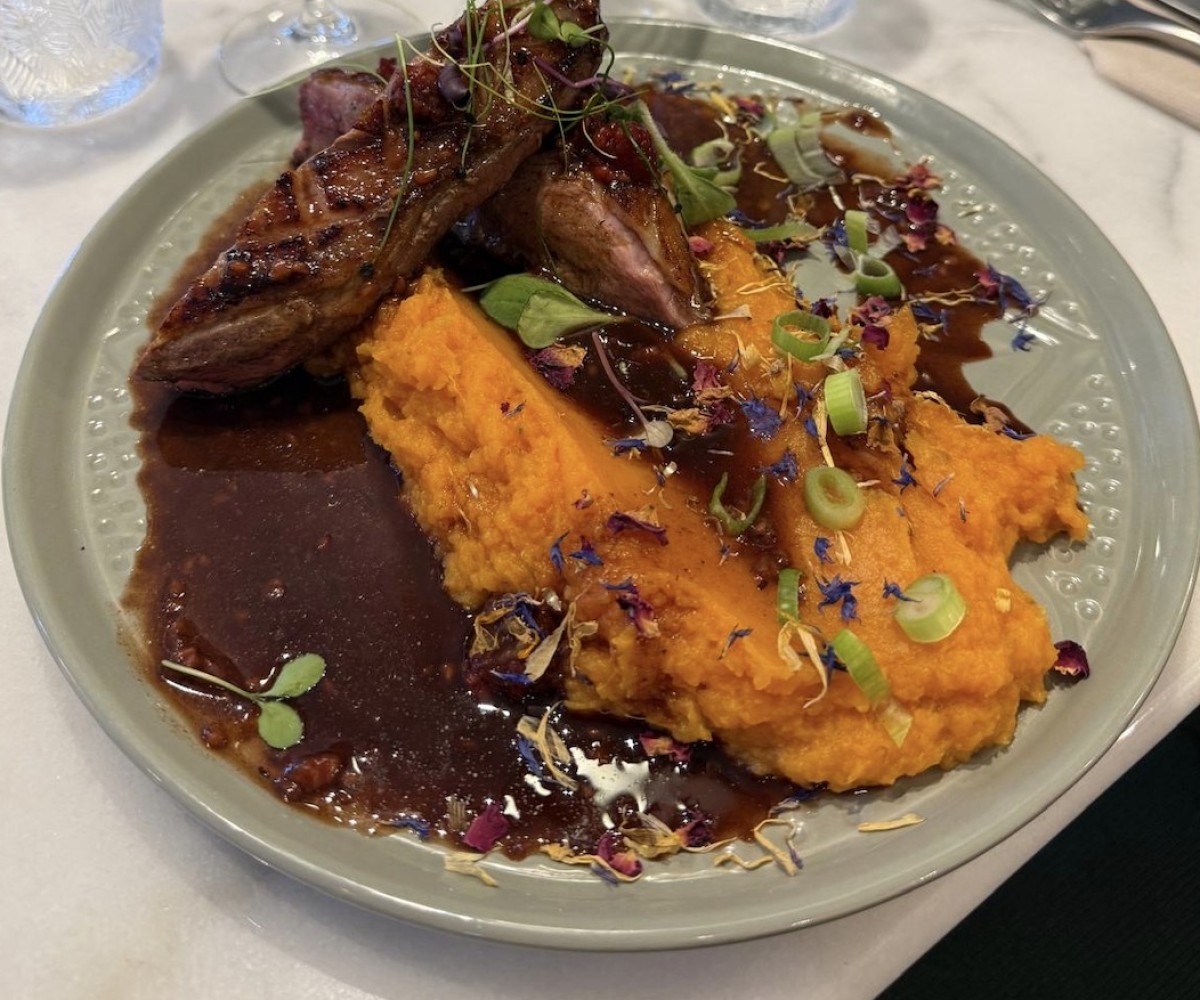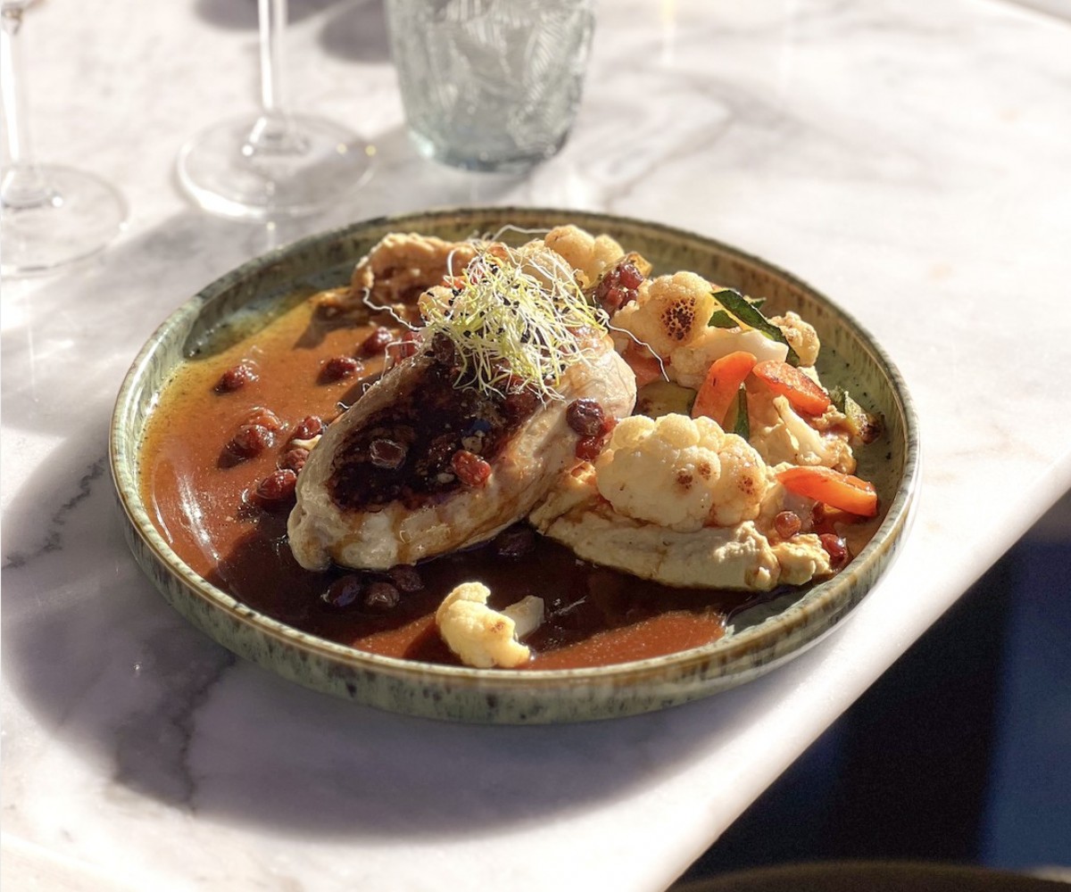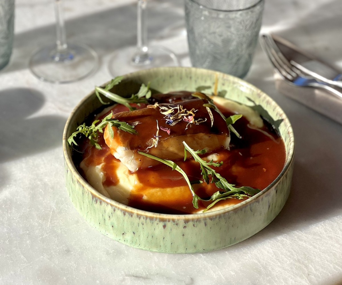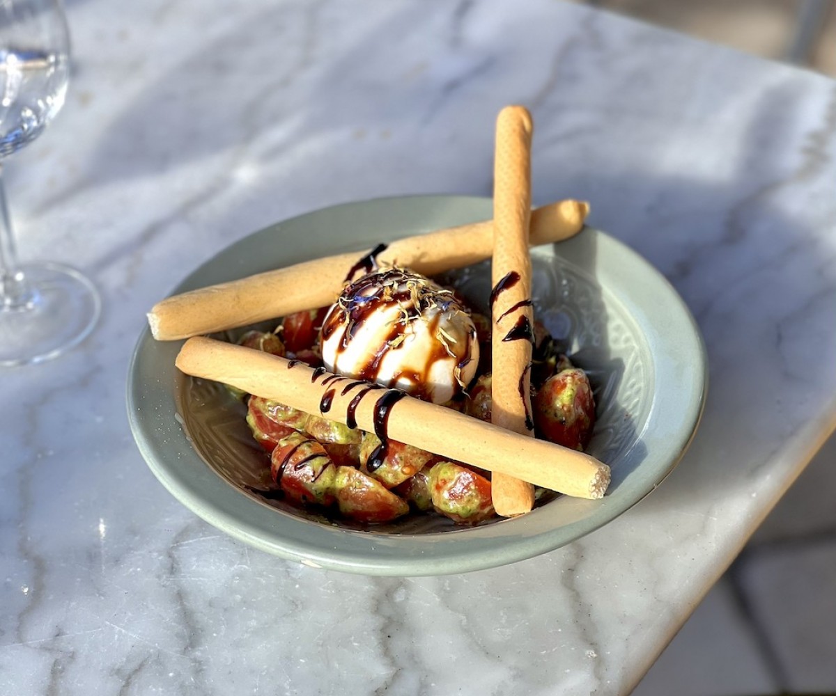 Accompagnée de tomates cerises au pesto, crème de balsamique et gressins