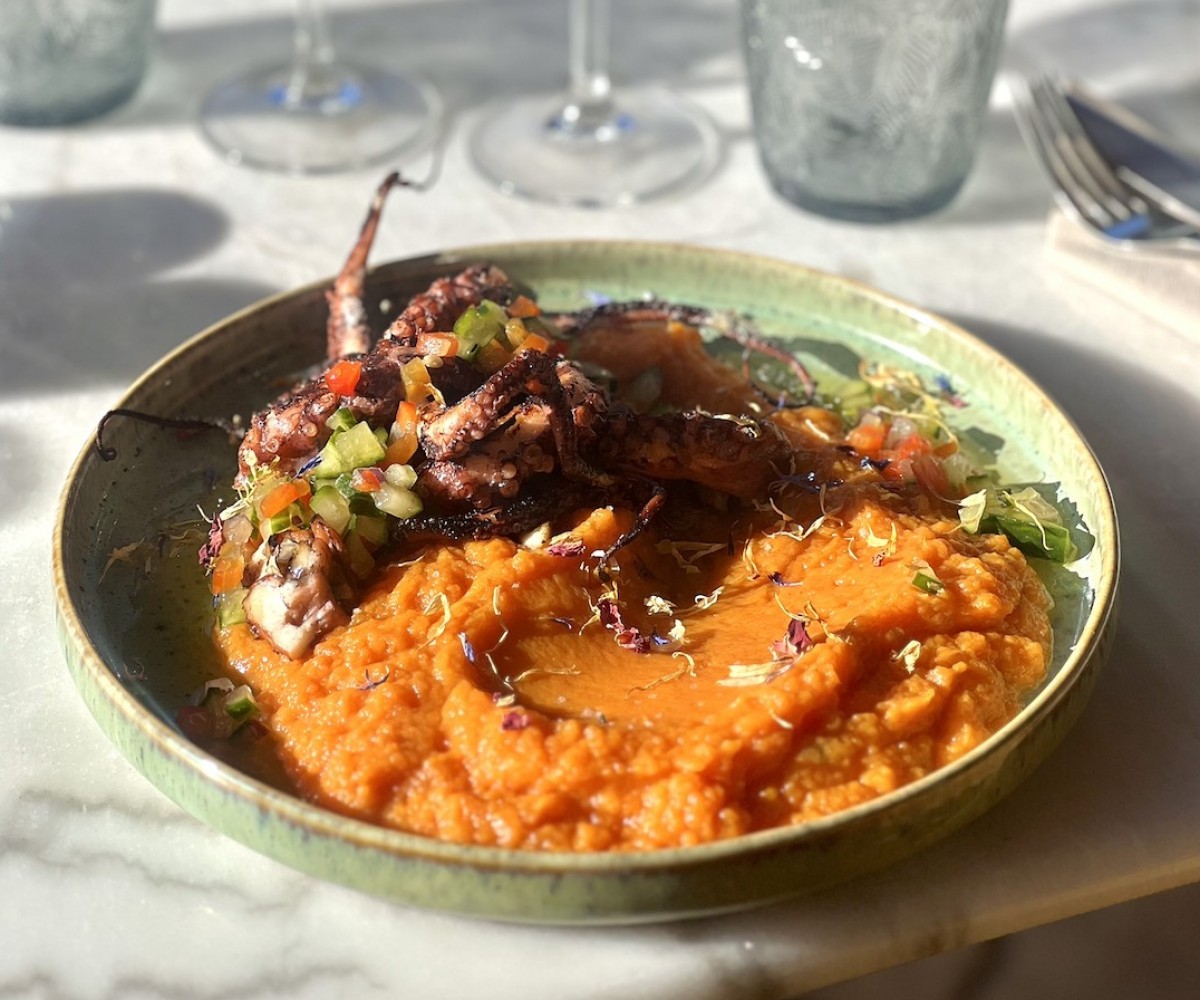 Poulpe grillé, pommes mitraille et poivrons sautés en persillade, tomates cerises, salade