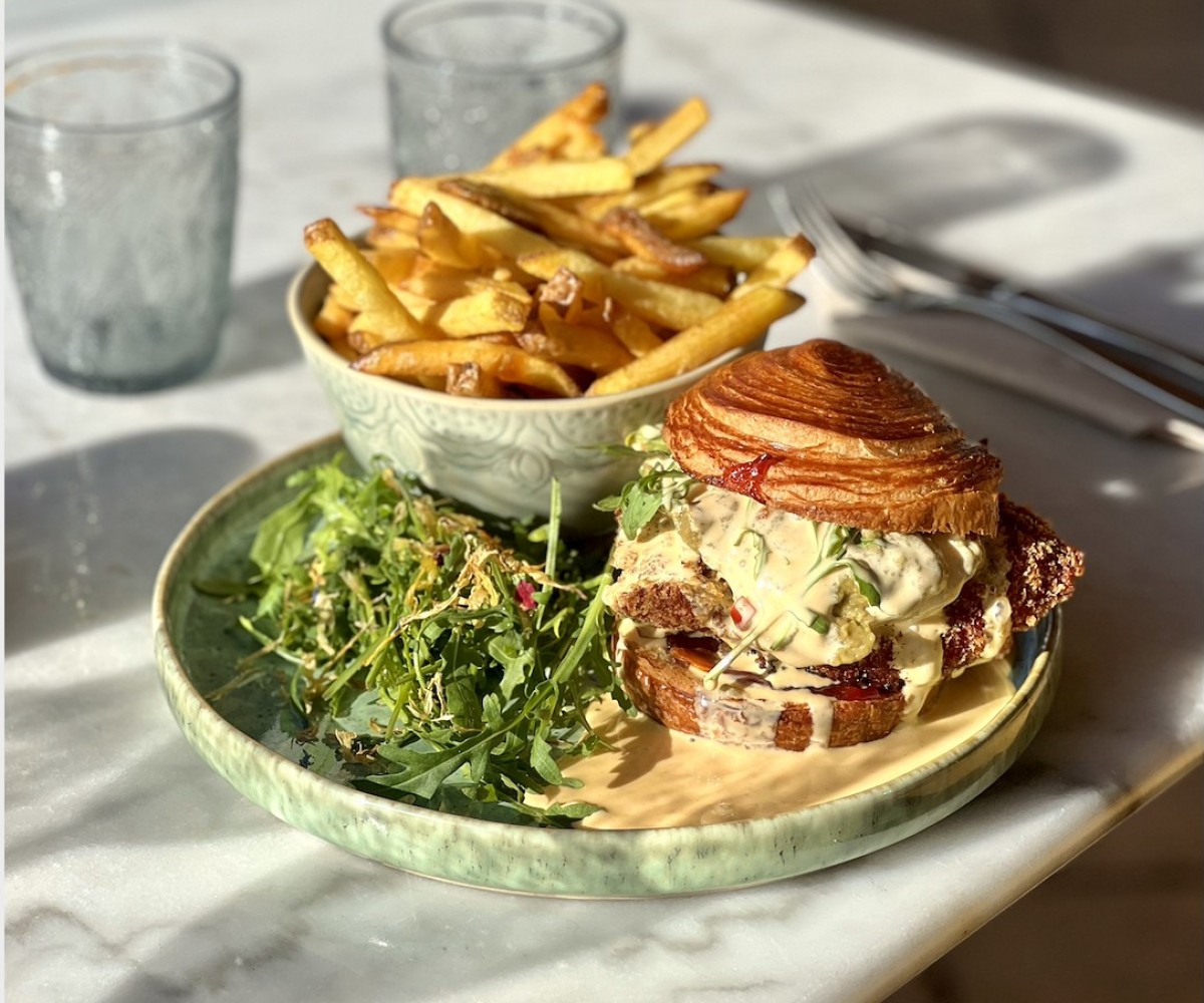 Pain burger feuilleté, steak frais, cheddar, oignons caramélisé, cornichons, tomate, salade, sauce barbecue