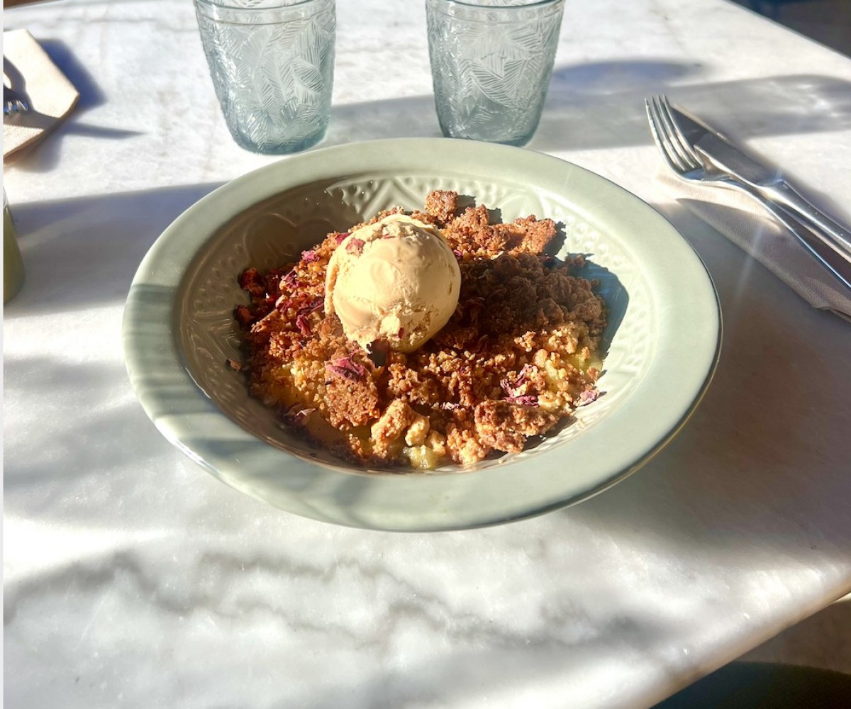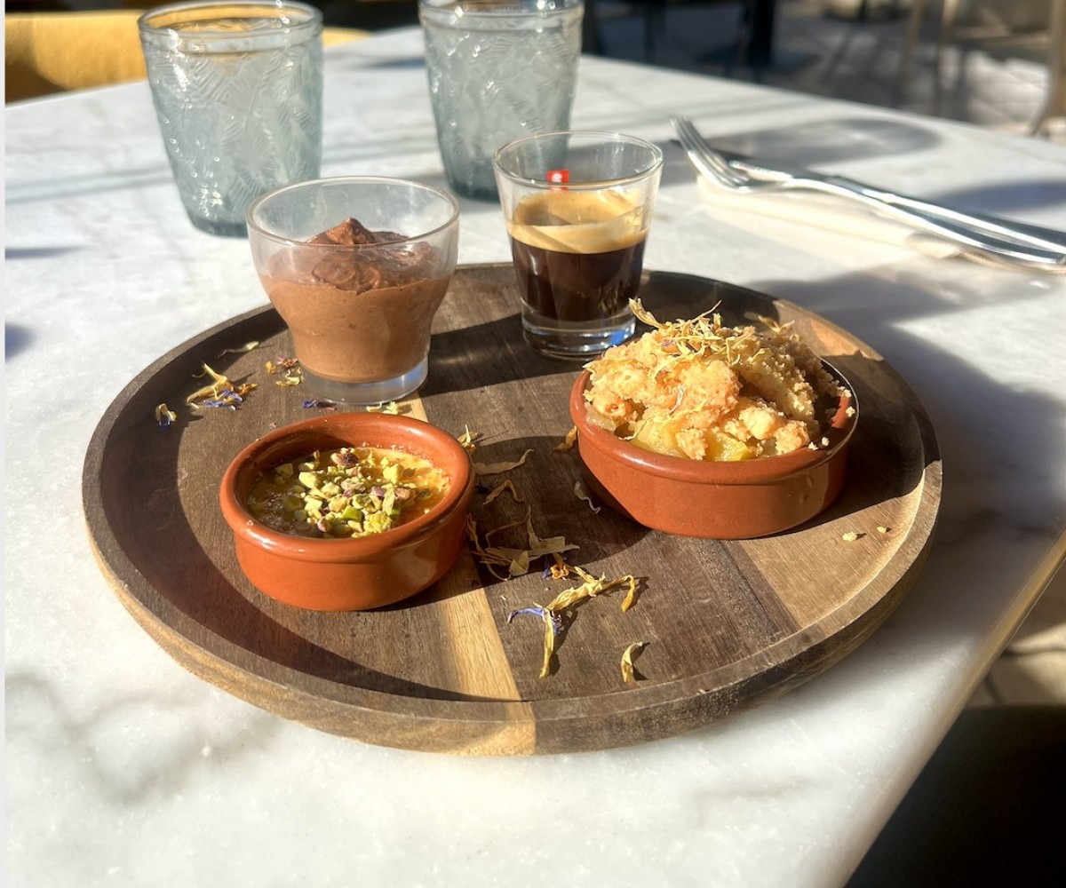 Feuilles de brick, chèvre, tapenade d'olive noire, miel, roquette, tomates cerises, pignons