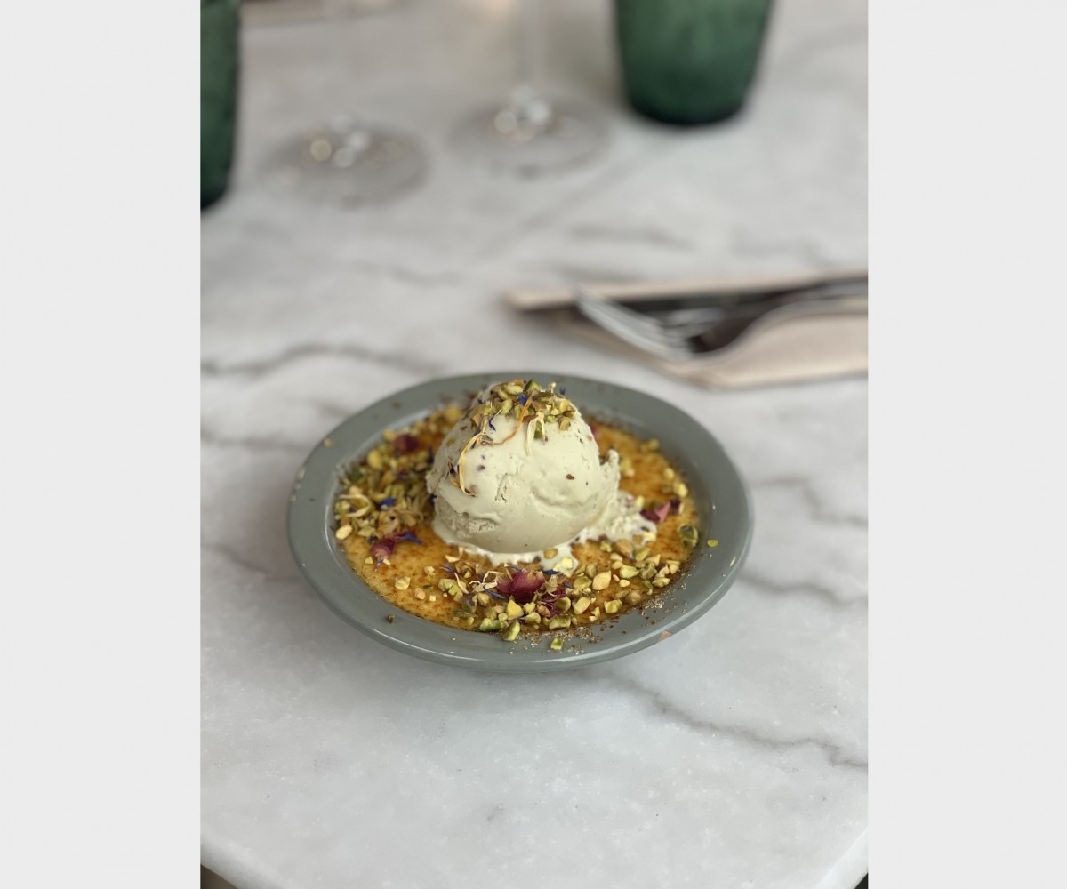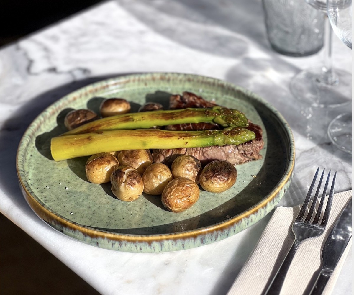 Asperges vertes grillées, crème de burrata, pistaches torréfiées