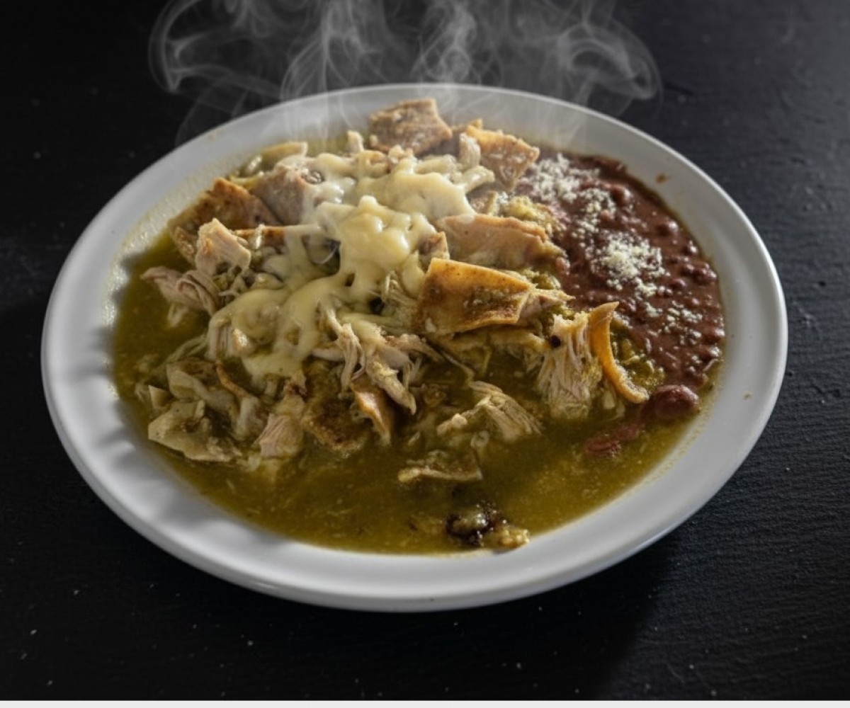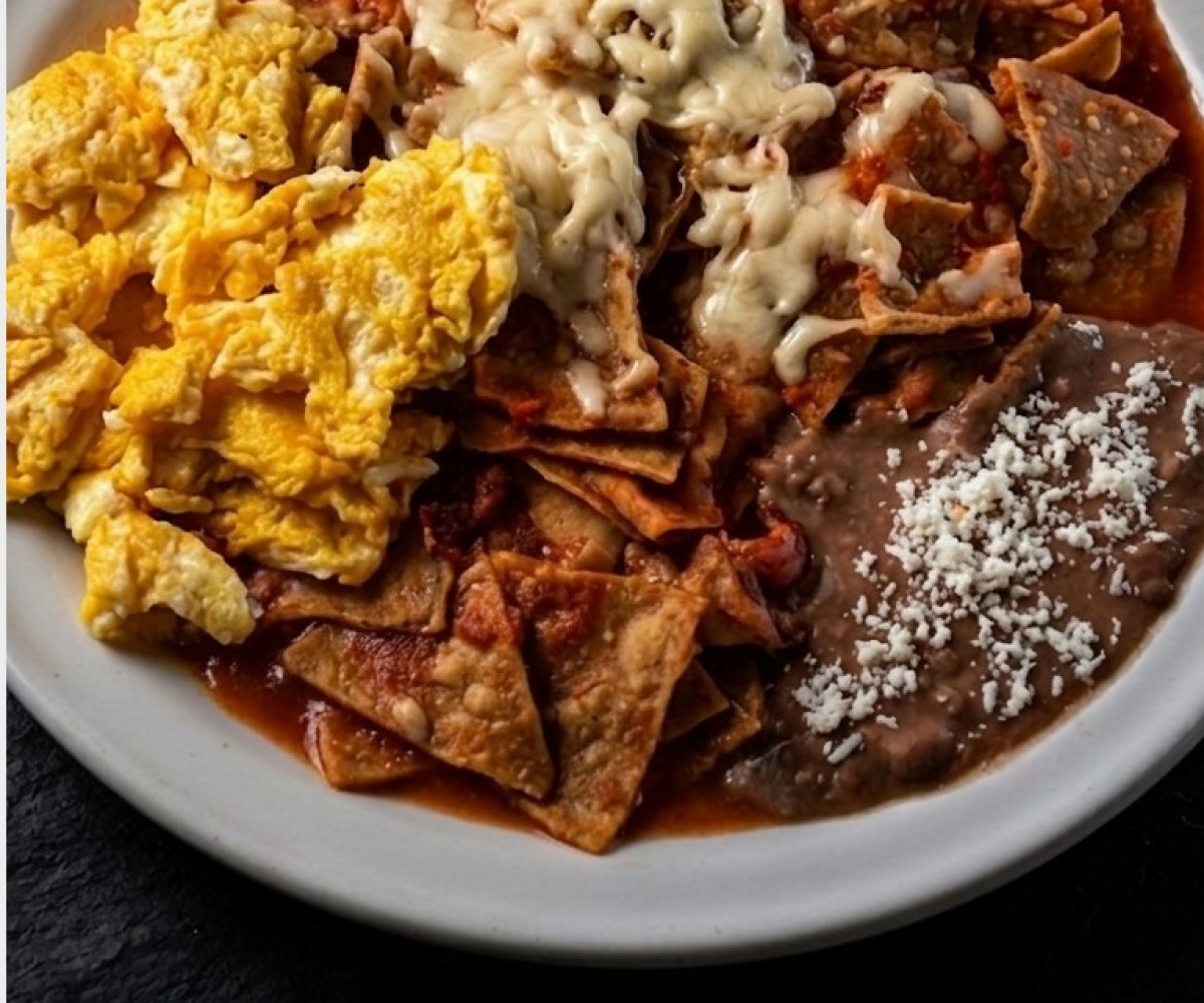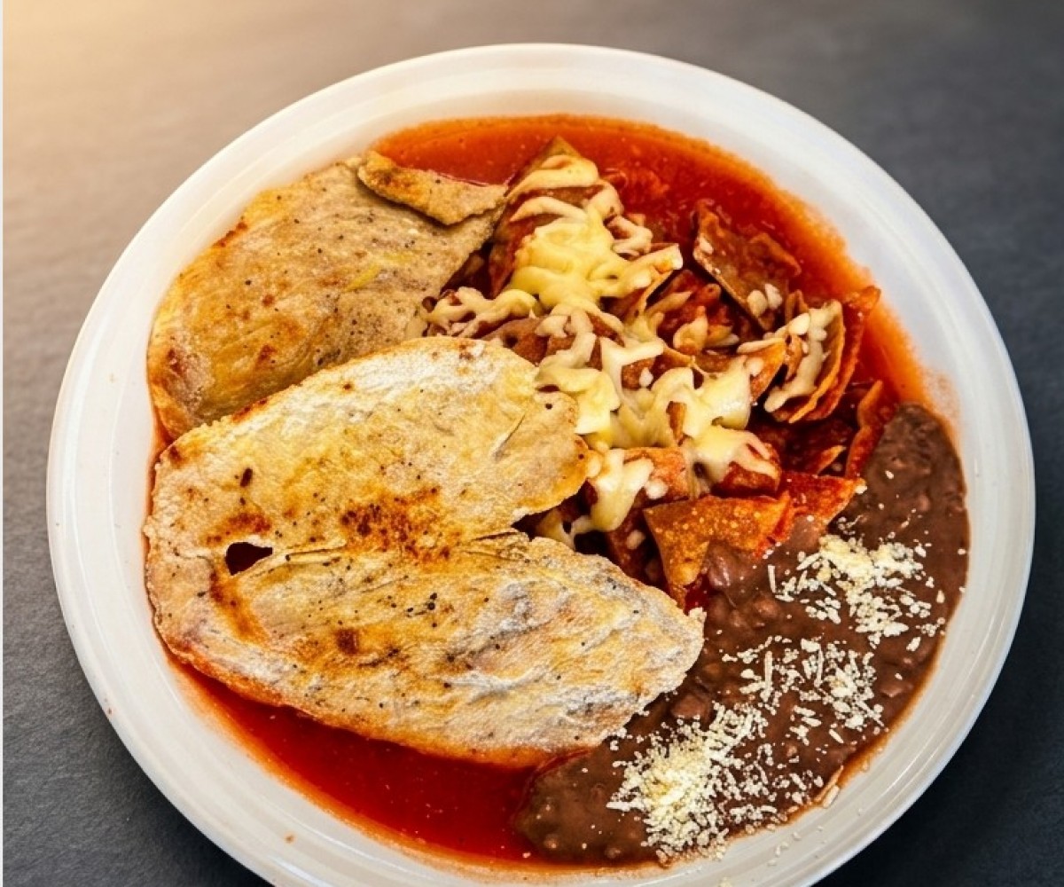 Tortilla chips bathed in sauce, with two fried eggs cooked to your liking (soft, medium or well cooked), topped with melted cheese, accompanied by refried beans with sprinkled dry cheese.