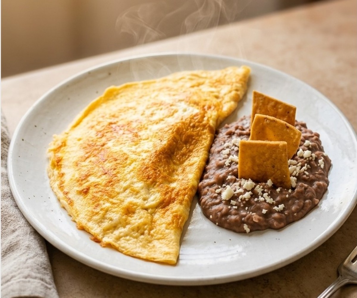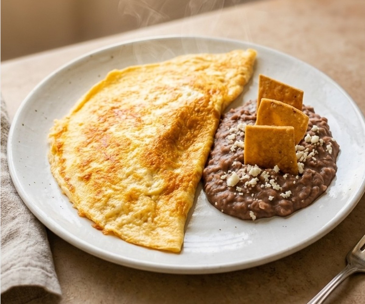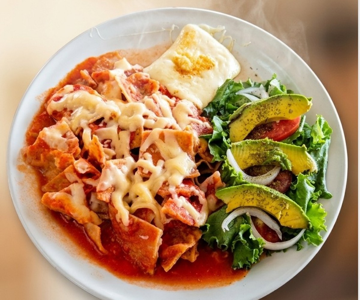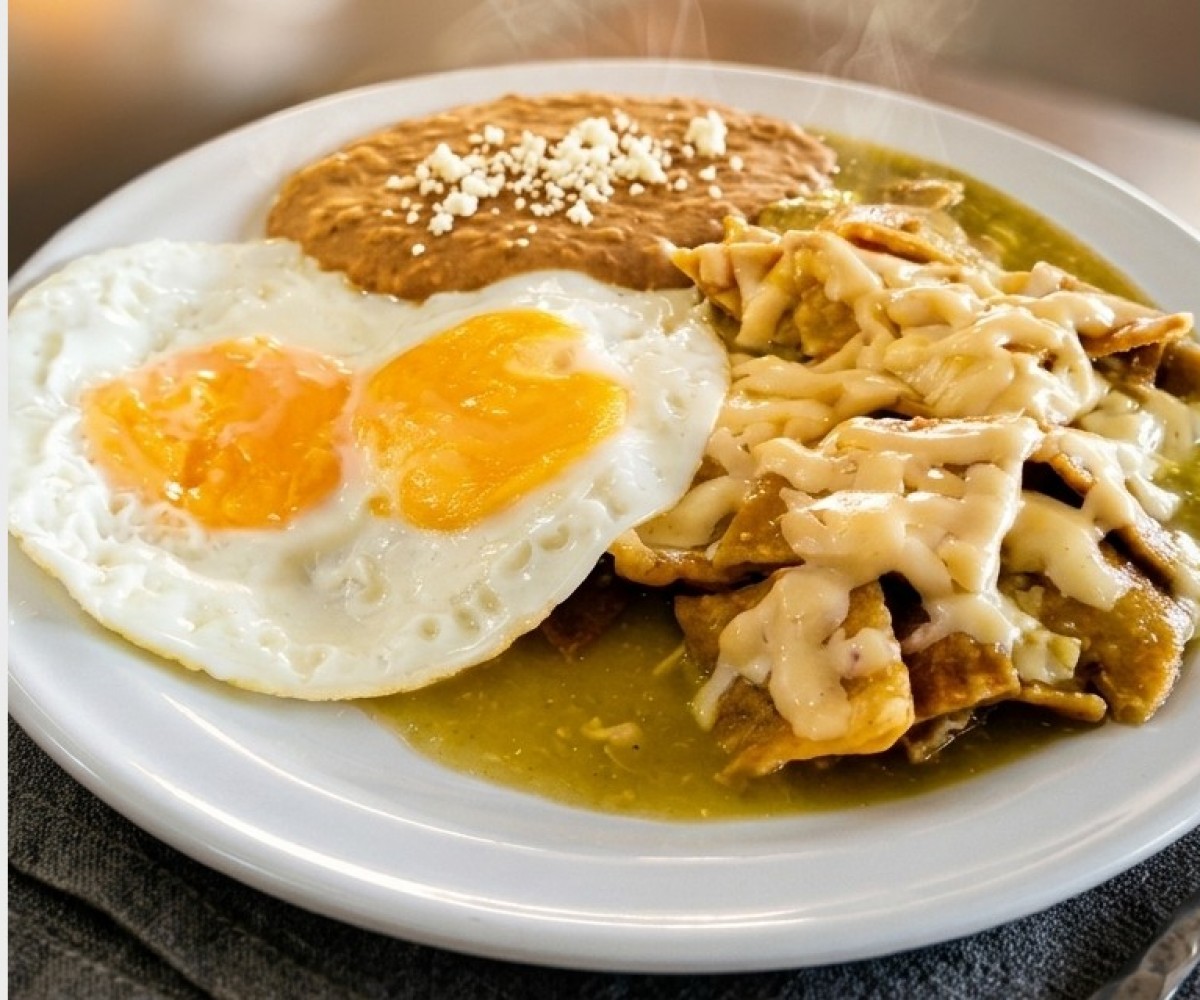 Tortilla chips bathed in sauce, with two fried eggs cooked to your liking (soft, medium or well cooked), topped with melted cheese, accompanied by refried beans with sprinkled dry cheese.