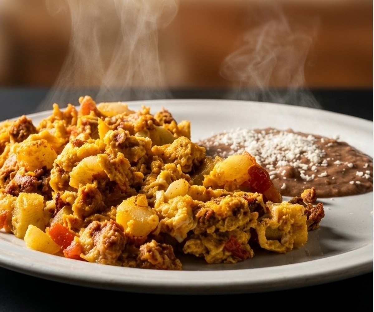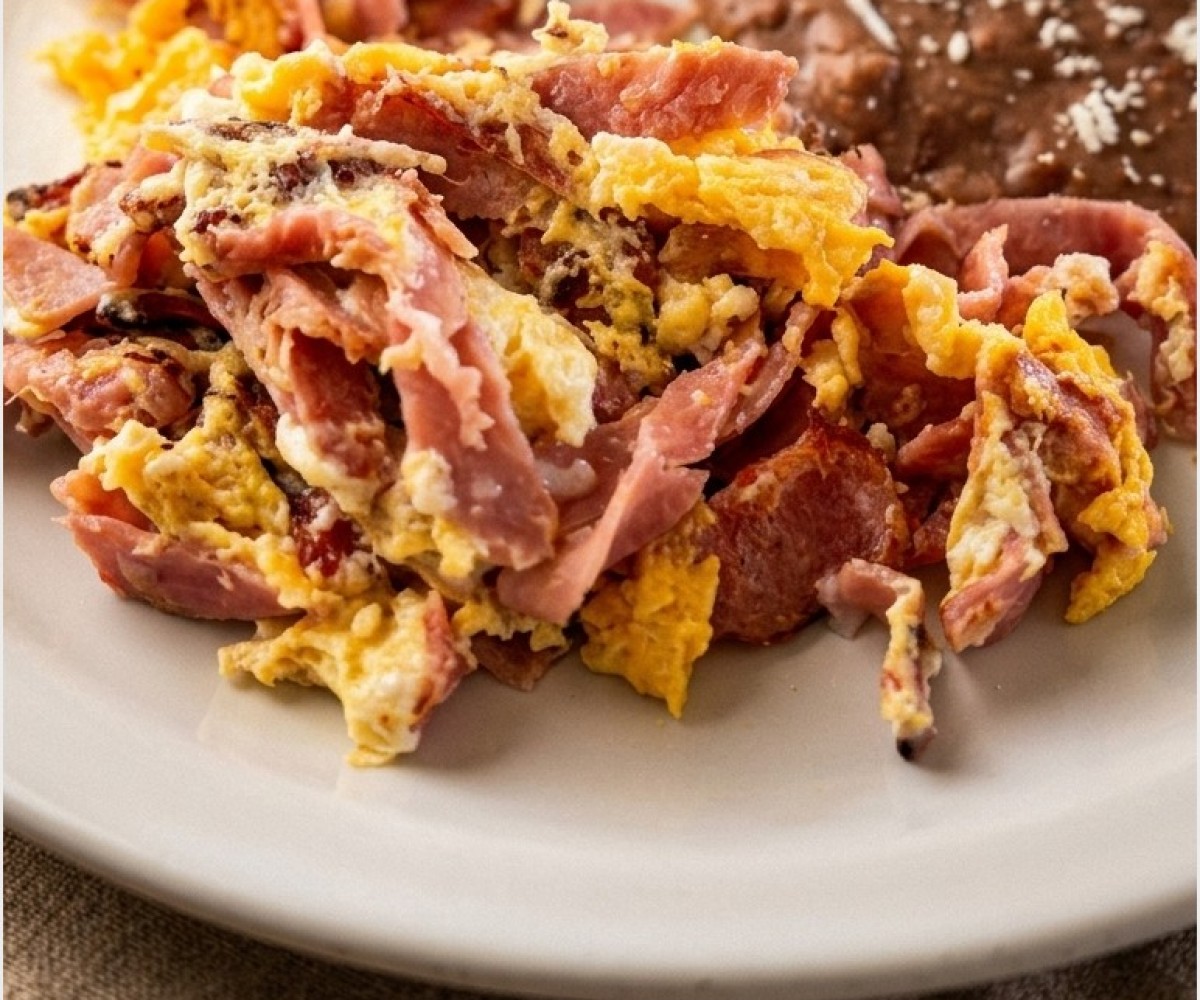 Scrambled eggs, cooked to your liking, accompanied by ham// smoked bacon// sausage or Michoacán chorizo.