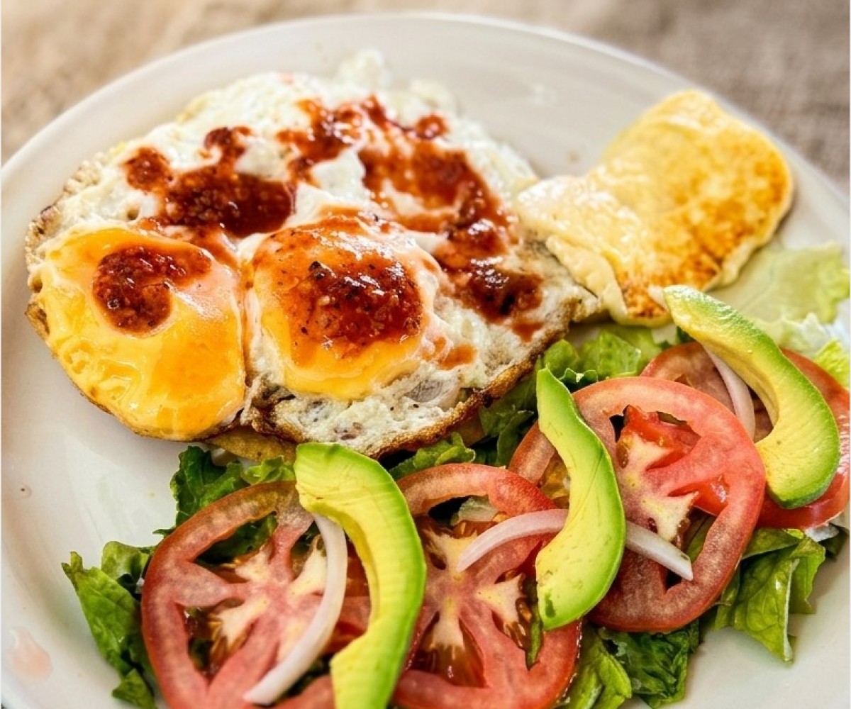 Eggs cooked to your liking, accompanied by roasted panela and fresh salad, with the option to choose the desired doneness: tender, medium, or well cooked.