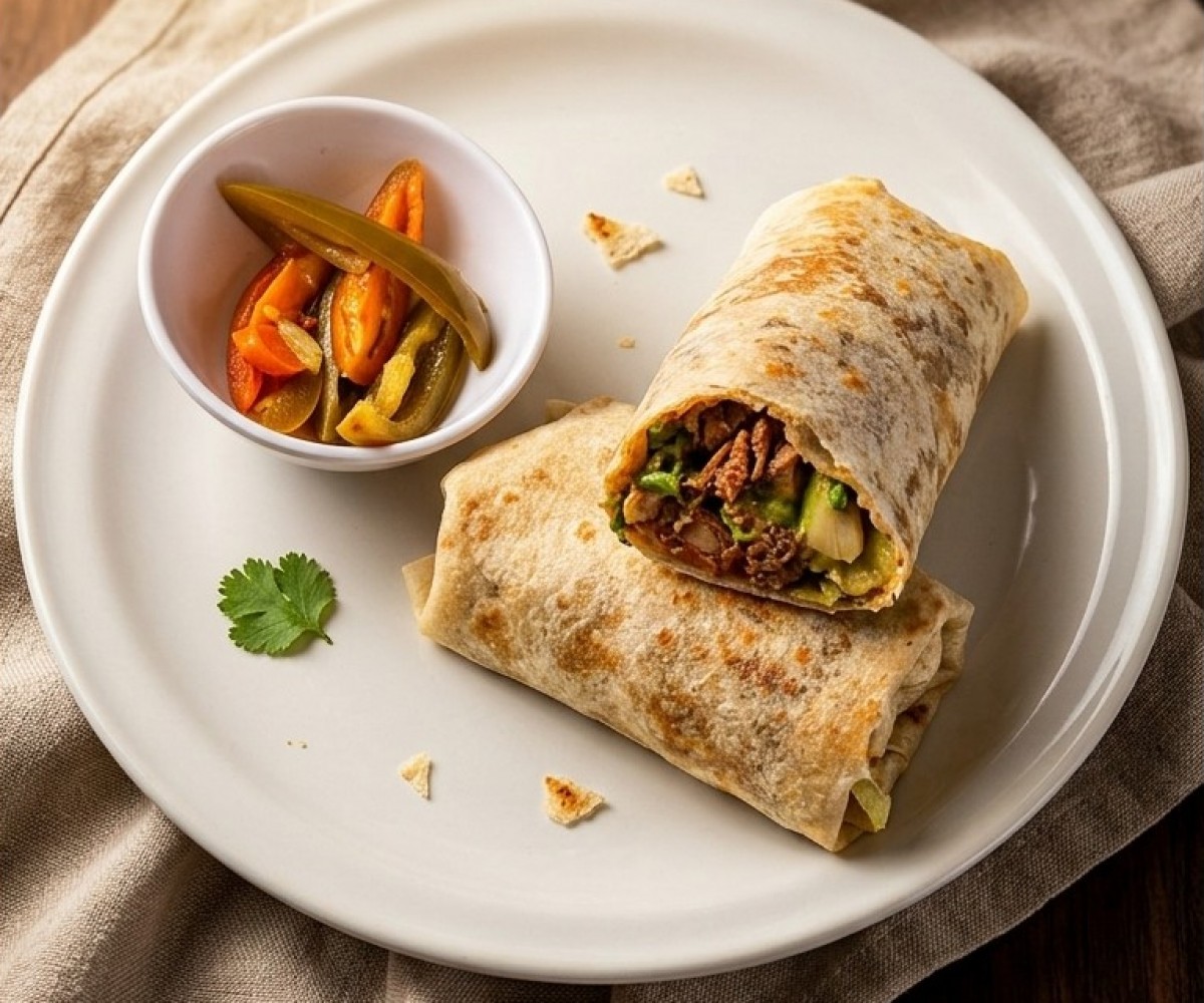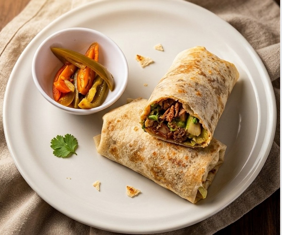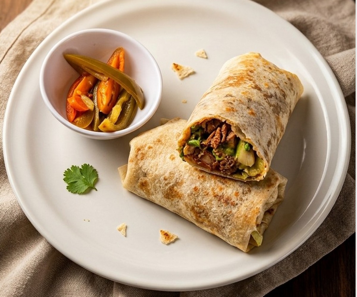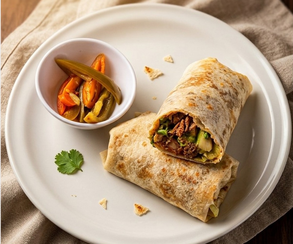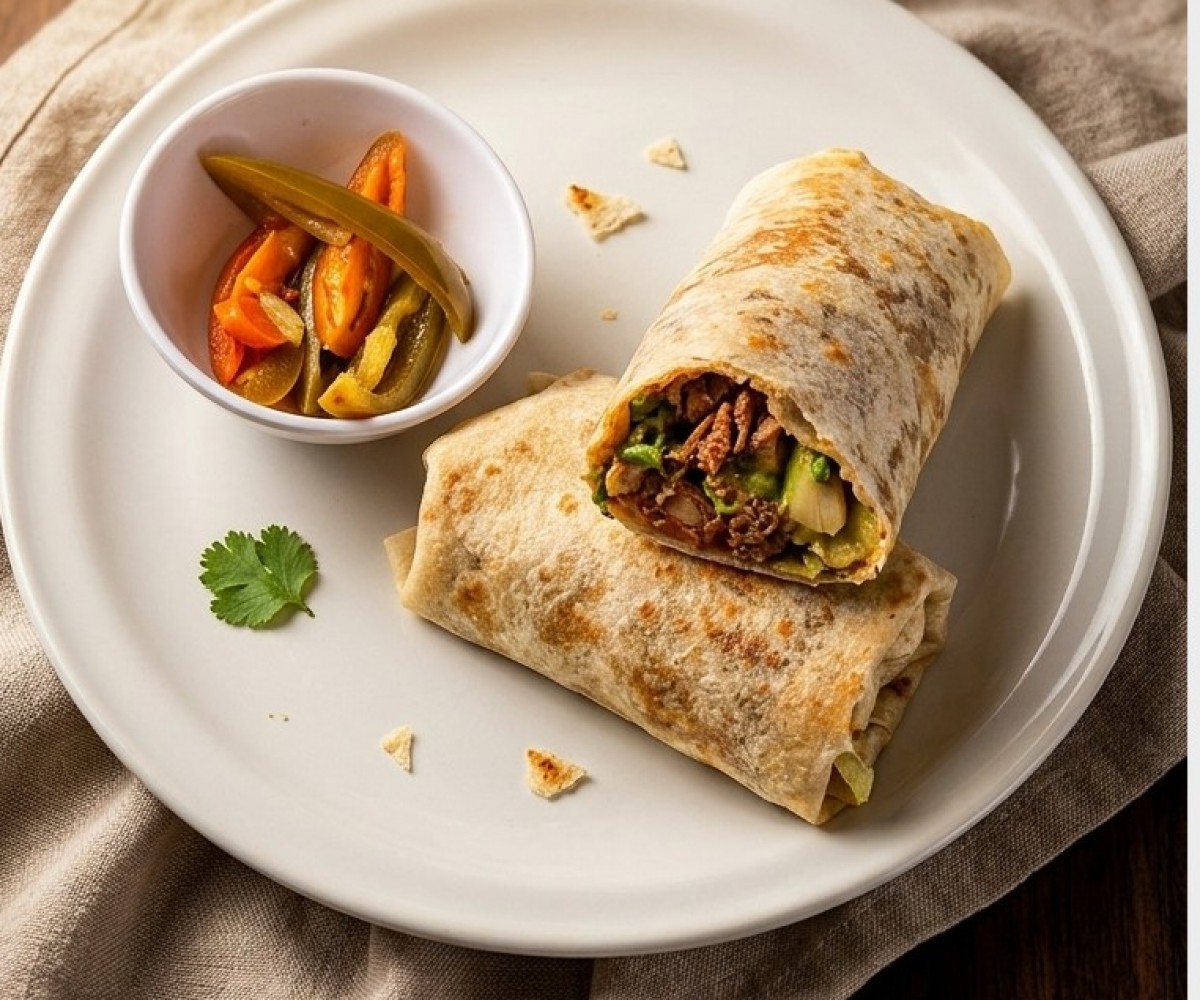 Flour tortilla filled with sausage, bacon and roasted mushrooms with its respective fresh vegetables.