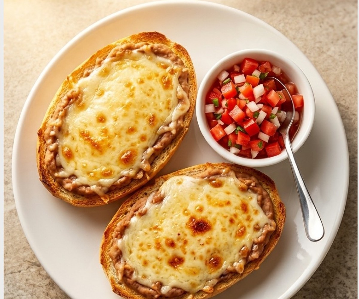 Artisan bread with refried beans, topped with cheese melted on a griddle.