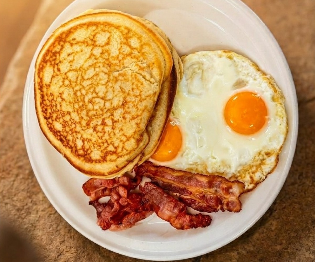Fluffy and golden, served with crispy bacon and two scrambled or fried eggs (cooked to your liking).