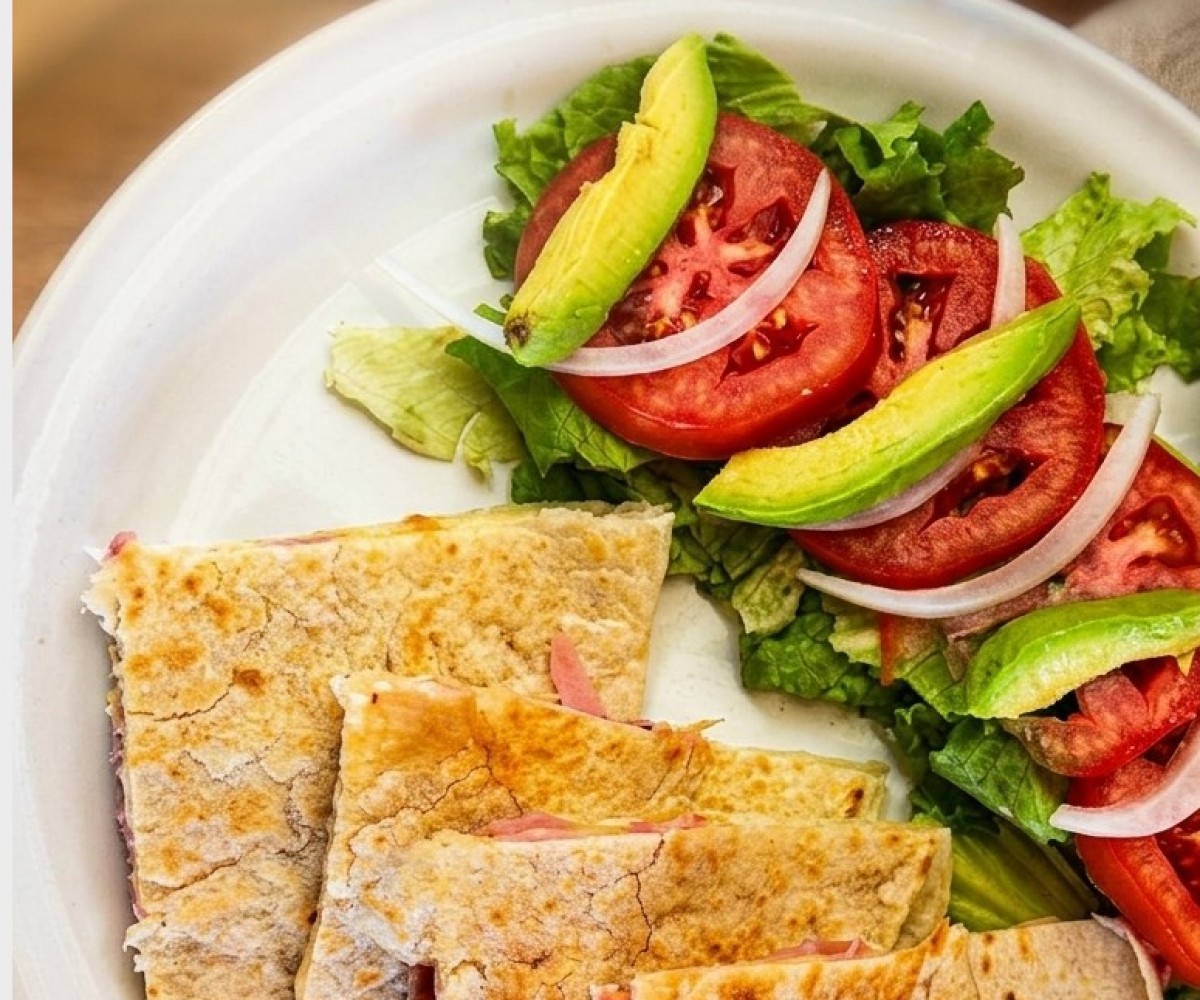 Flour tortilla filled with ham // chorizo // bacon // sausage // mushrooms with pepper and onion, served with its respective fresh salad.