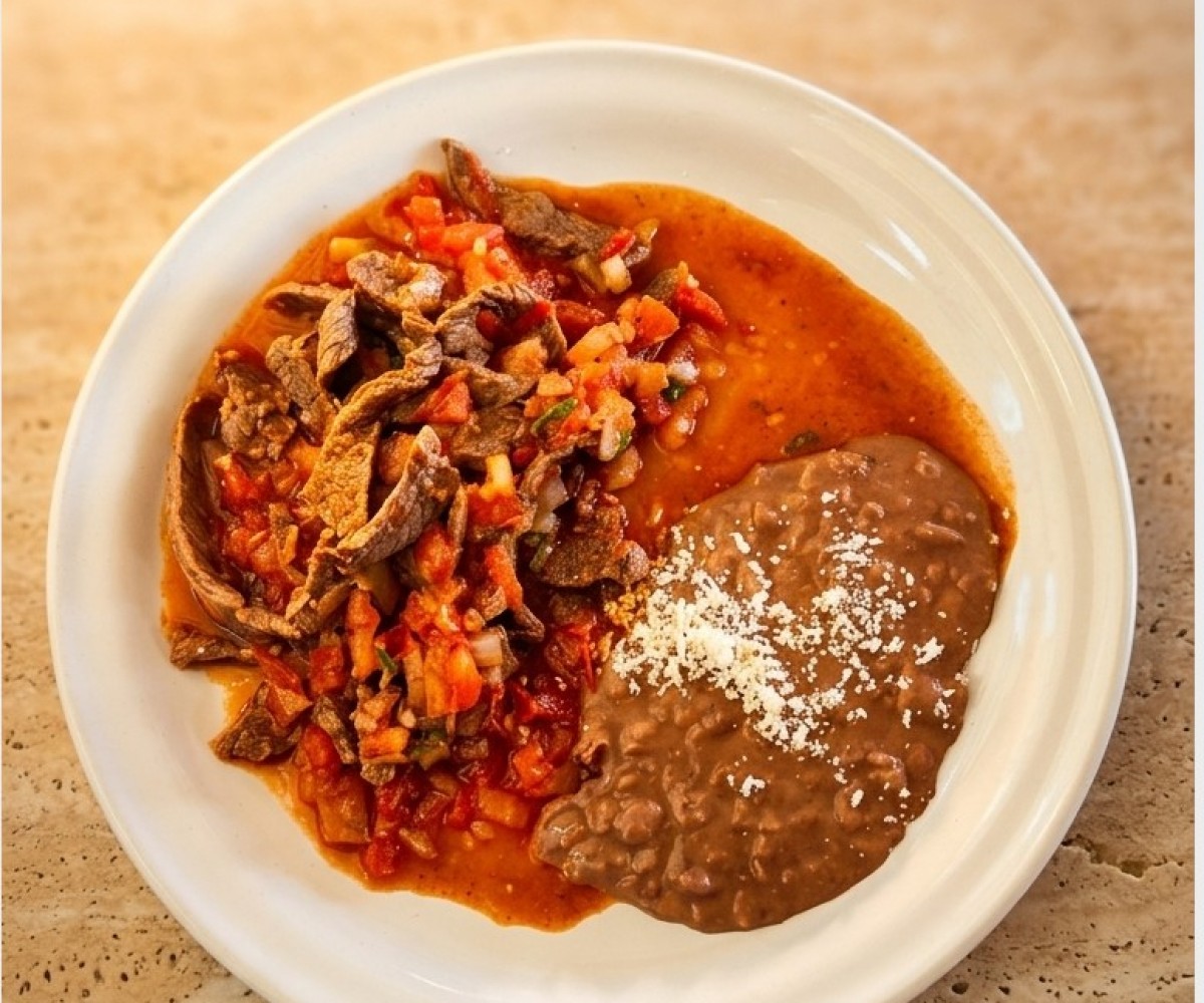 Juicy beef fajitas, accompanied by grilled onions, serrano peppers, and beans with sprinkled dry cheese.