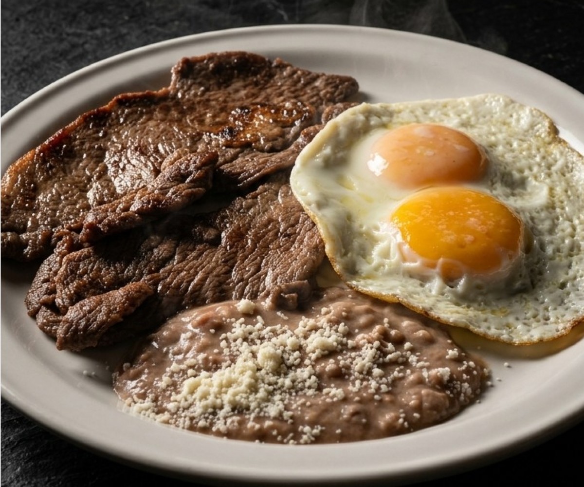 Juicy grilled meat, served with refried beans sprinkled with dry cheese and grilled panela cheese.