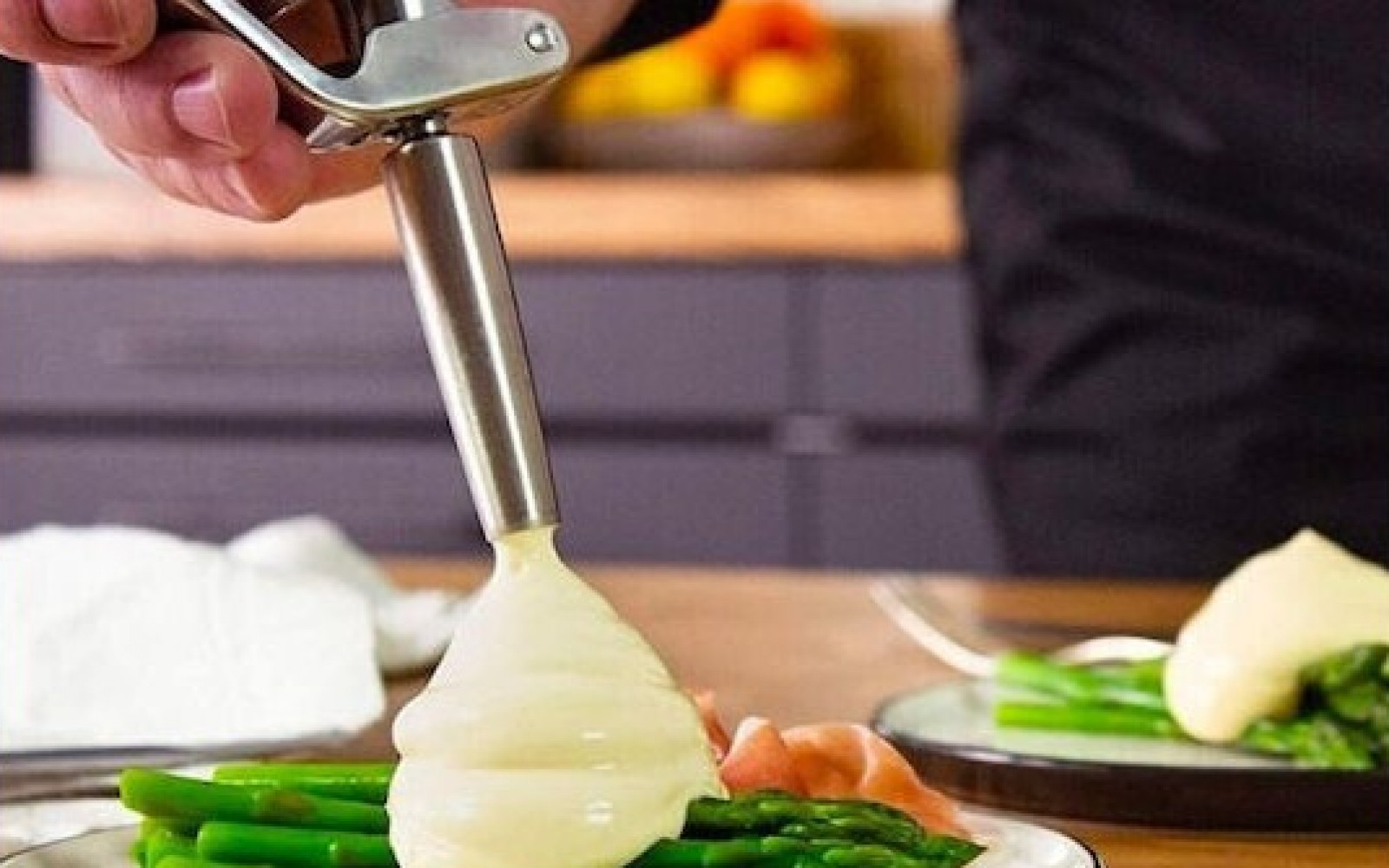 The pork knuckle, marinated with aromatic herbs and orange, is slowly roasted in a wood-fired oven for 5 hours. It is accompanied by sweet potato puree and sage.