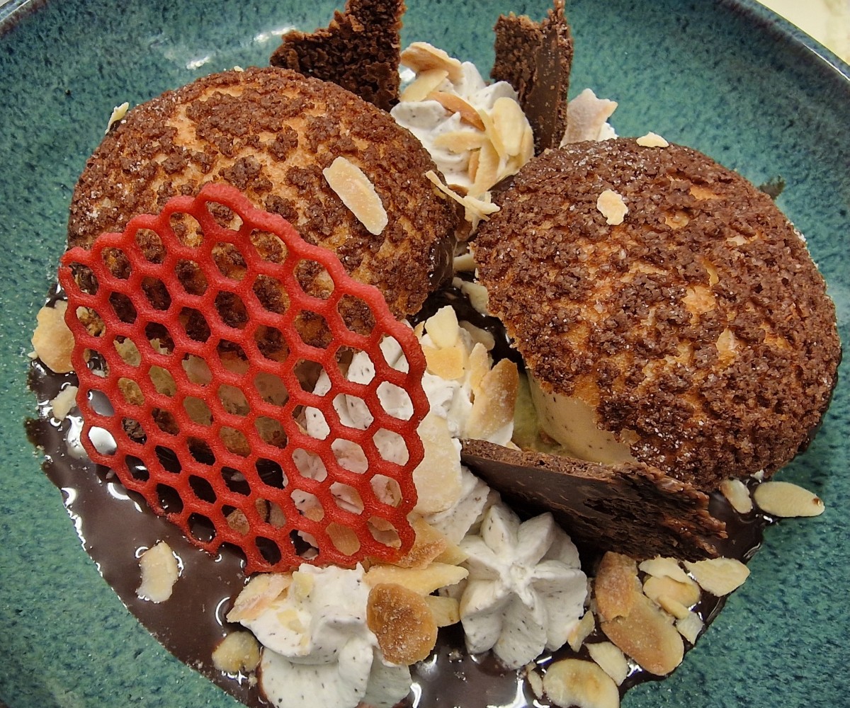 Les profiteroles 100% maison d'AlexisChou maison, glace vanille maison, sauce choc maison et amandes effilées