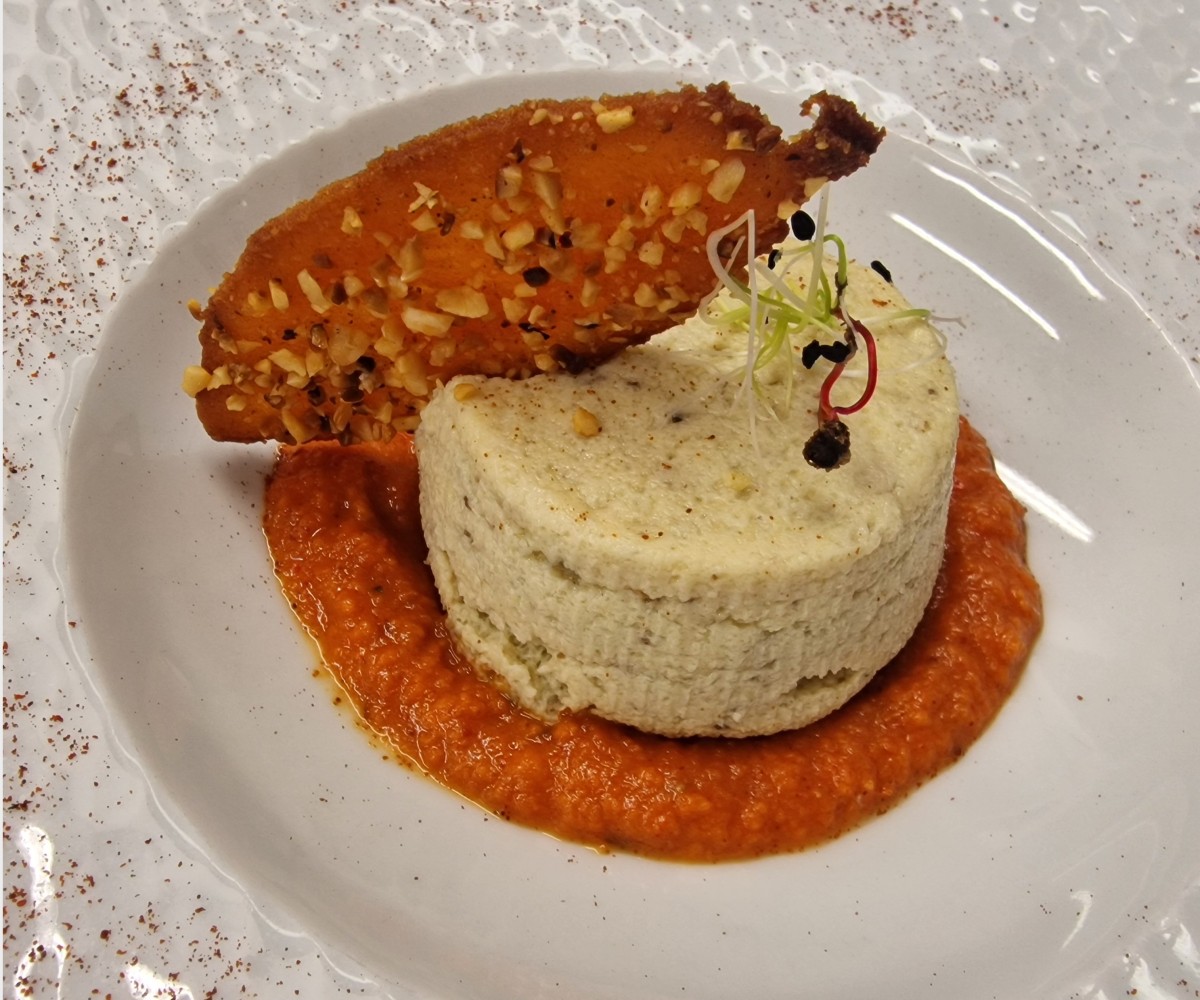 Flan de chou-fleur, coulis de poivrons rôtis et tuile de noisettes torréfiées
