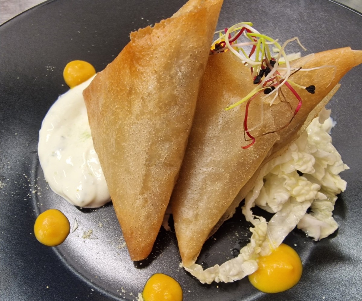 Samoussa thon-olive-feta, sauce yaourt au basilic