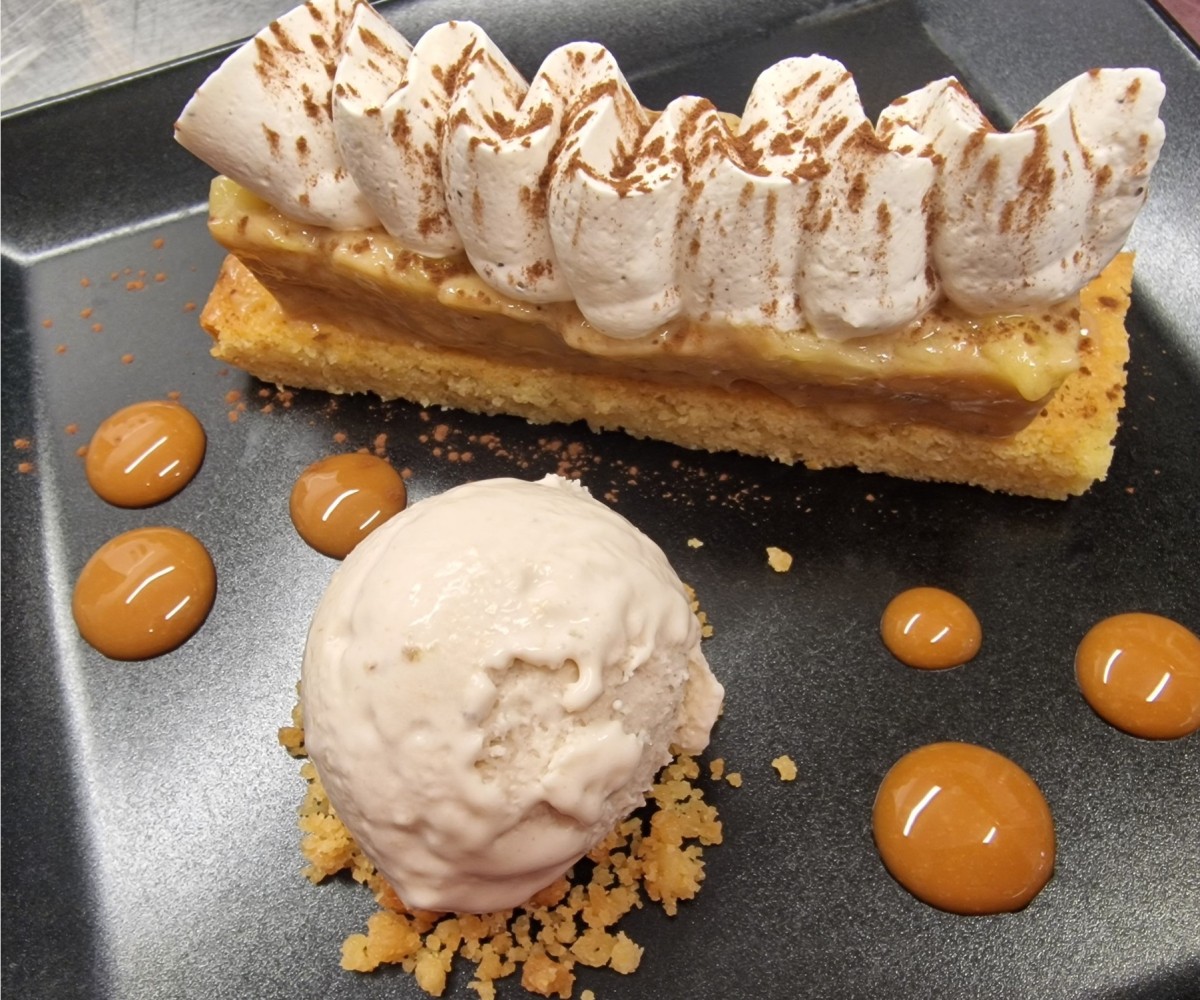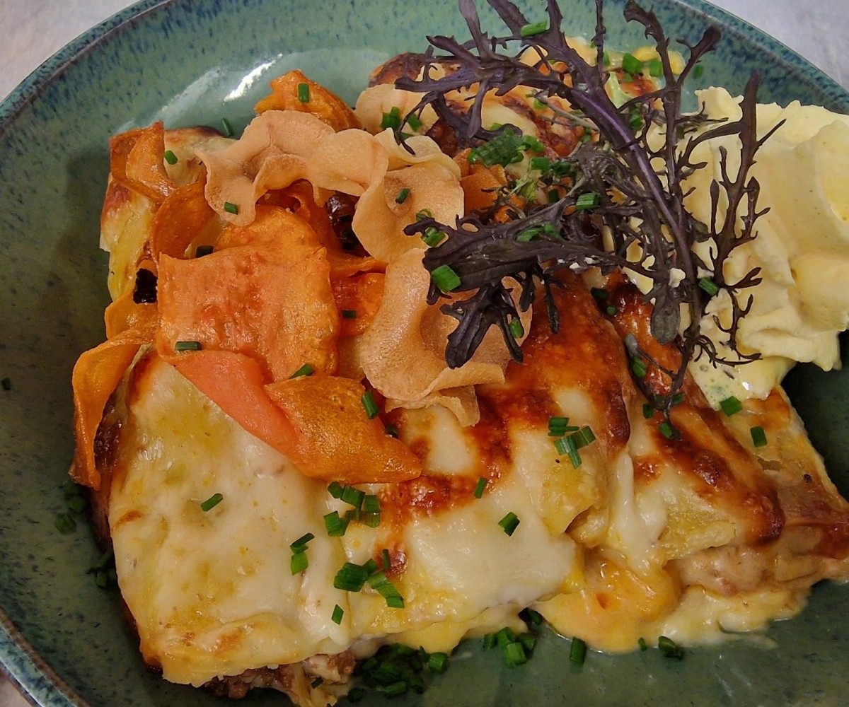 Cannelonis à la bolognaise, émulsion de moutarde, chips de panais et de patate douce