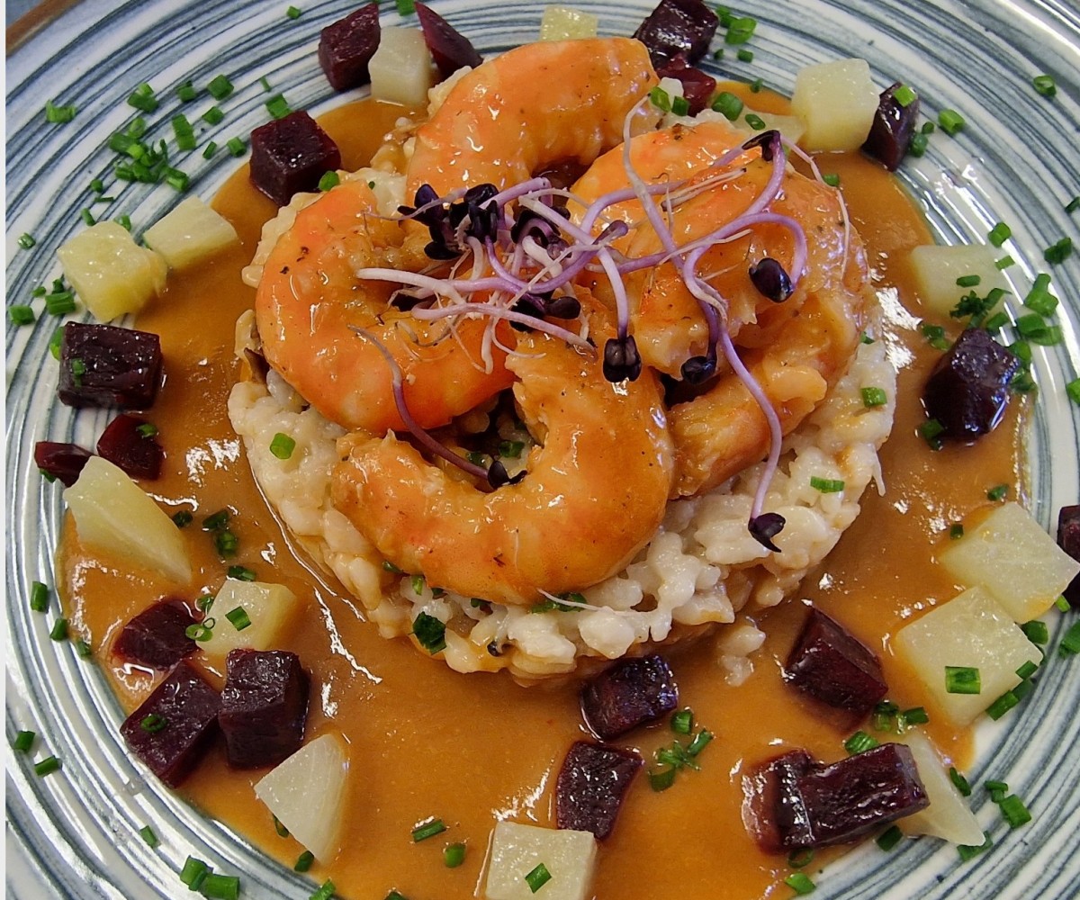 Crevettes sautées, risotto aux girolles, sauce thaï, duo de betterave