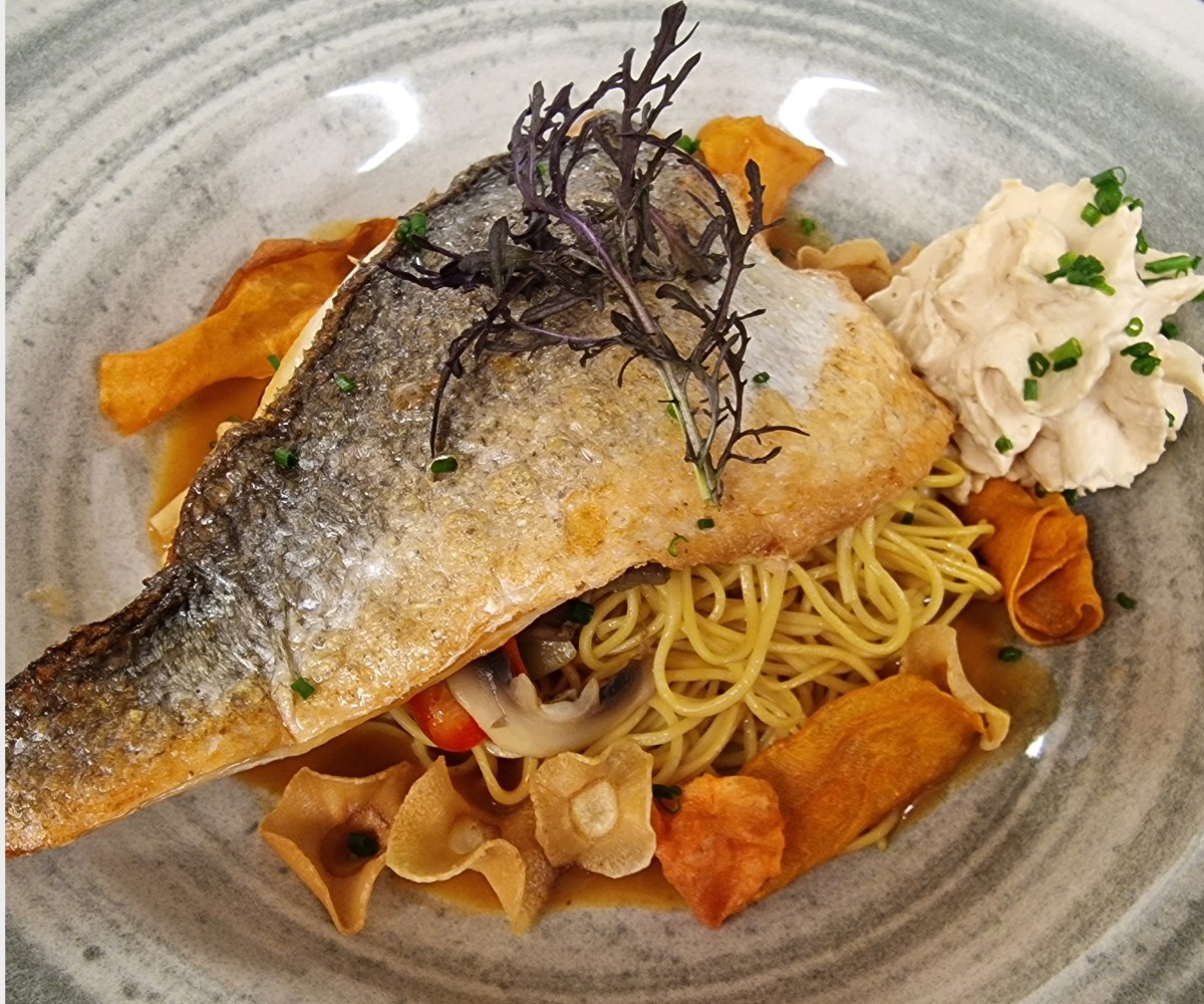 Filet de daurade cuit sur peau,nouilles chinoises sautées aux légumes, émulsion de soja