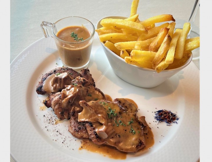 Filet mignon de porc (CH), sauce au mélange de champignons, garniture auchoix.