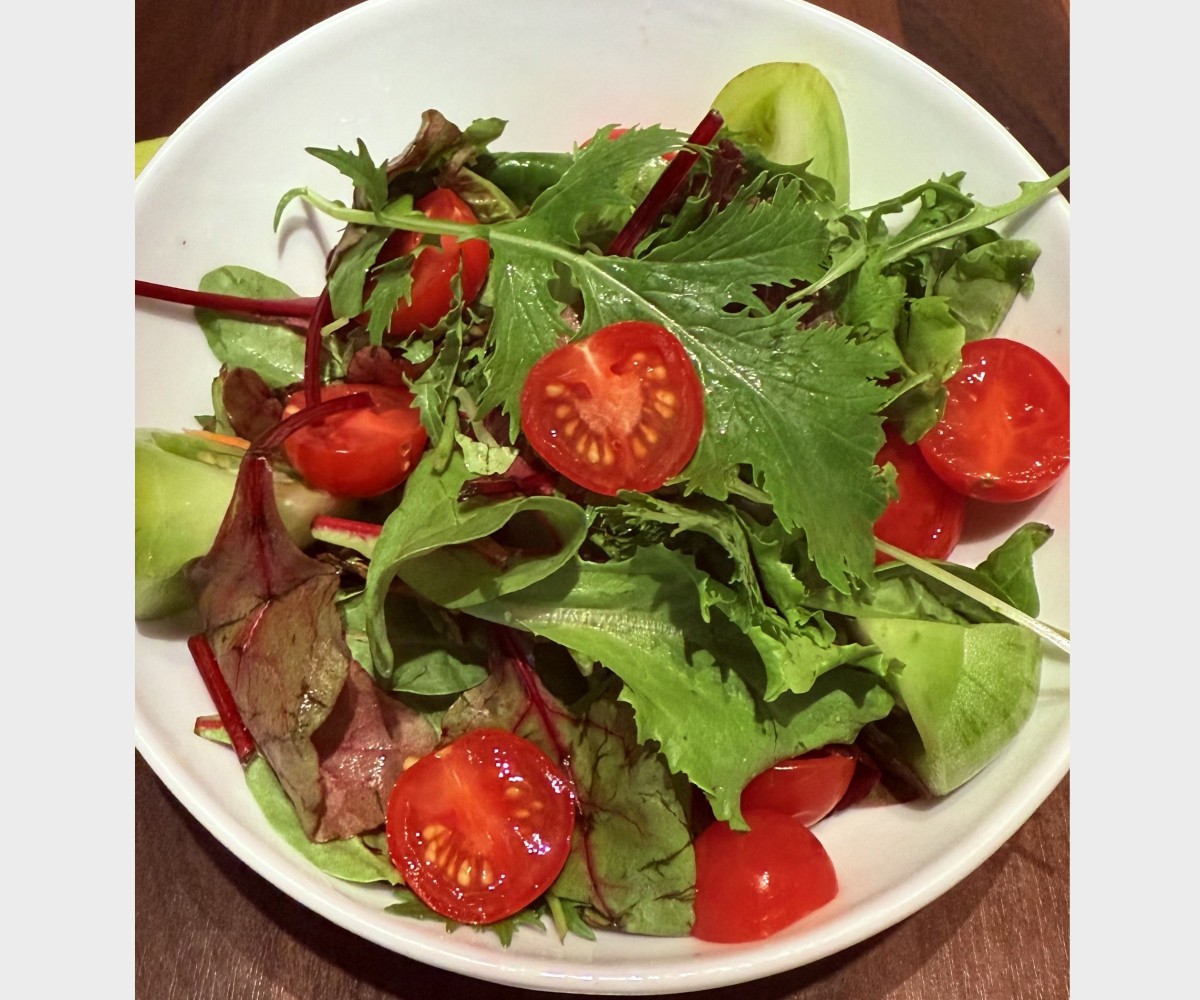 Mélange de salade verte, cœurs d’artichaut, tomates,œufs durs, lardons, Grana Padano,