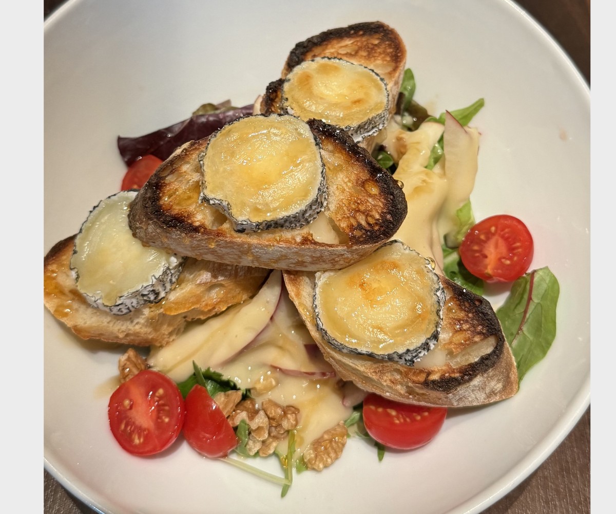 Mélange de salade, chèvre chaud au miel sur paingrillé, tomates cerises, julienne de pommes, noix,