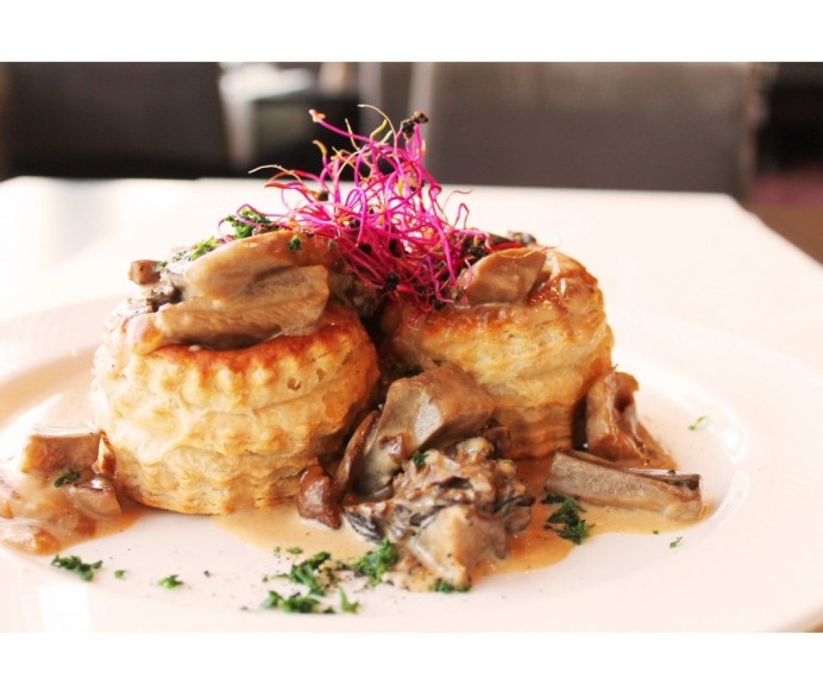 Feuilletés garnis de champignons sautés, sauce crémeuse. Garniture au choixPâtes