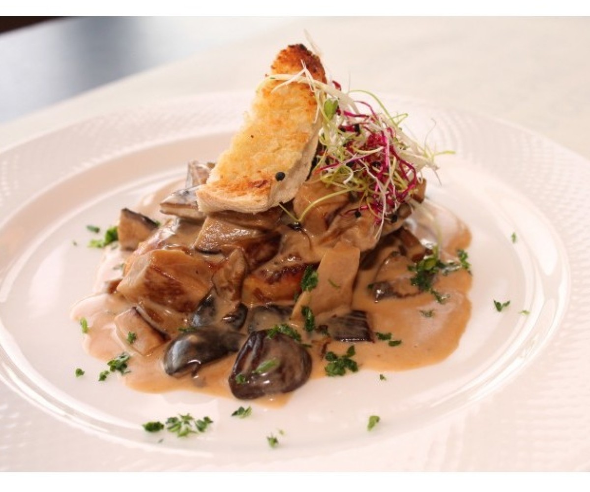 Mélange de champignons sautés, sauce crémeuse, paincroquant à l’ail grillé