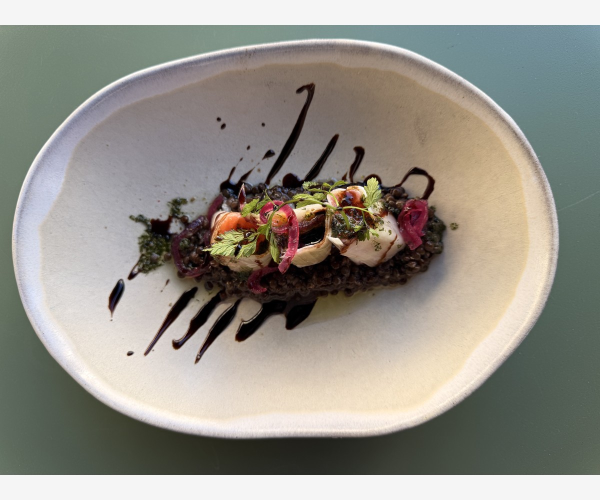 Маринованные маки из сырого лосося, фромаж блан, лук-порей и чечевица