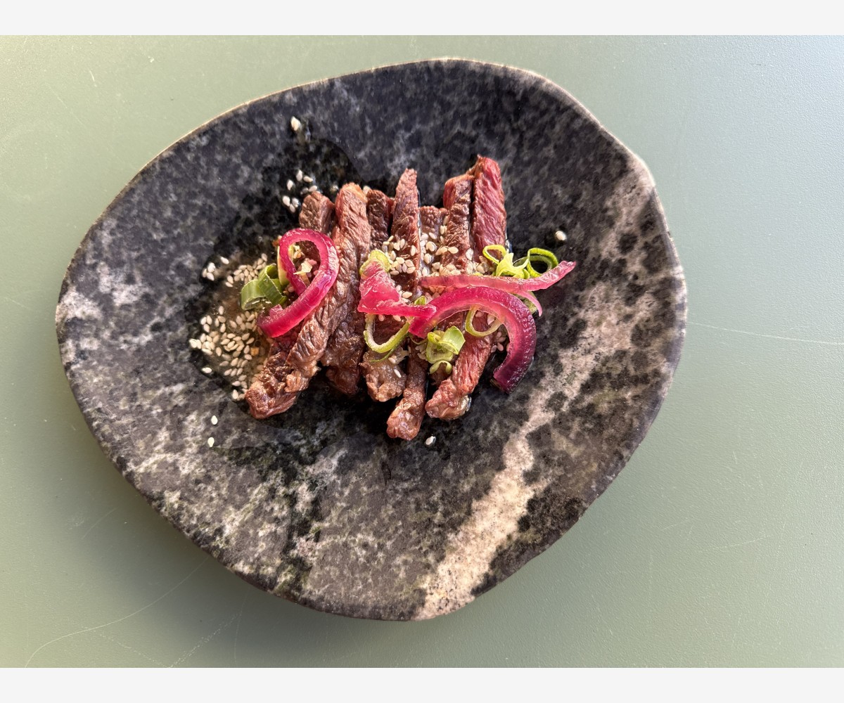 Татаки из говядины с апельсином, имбирем и поджаренными семенами кунжута