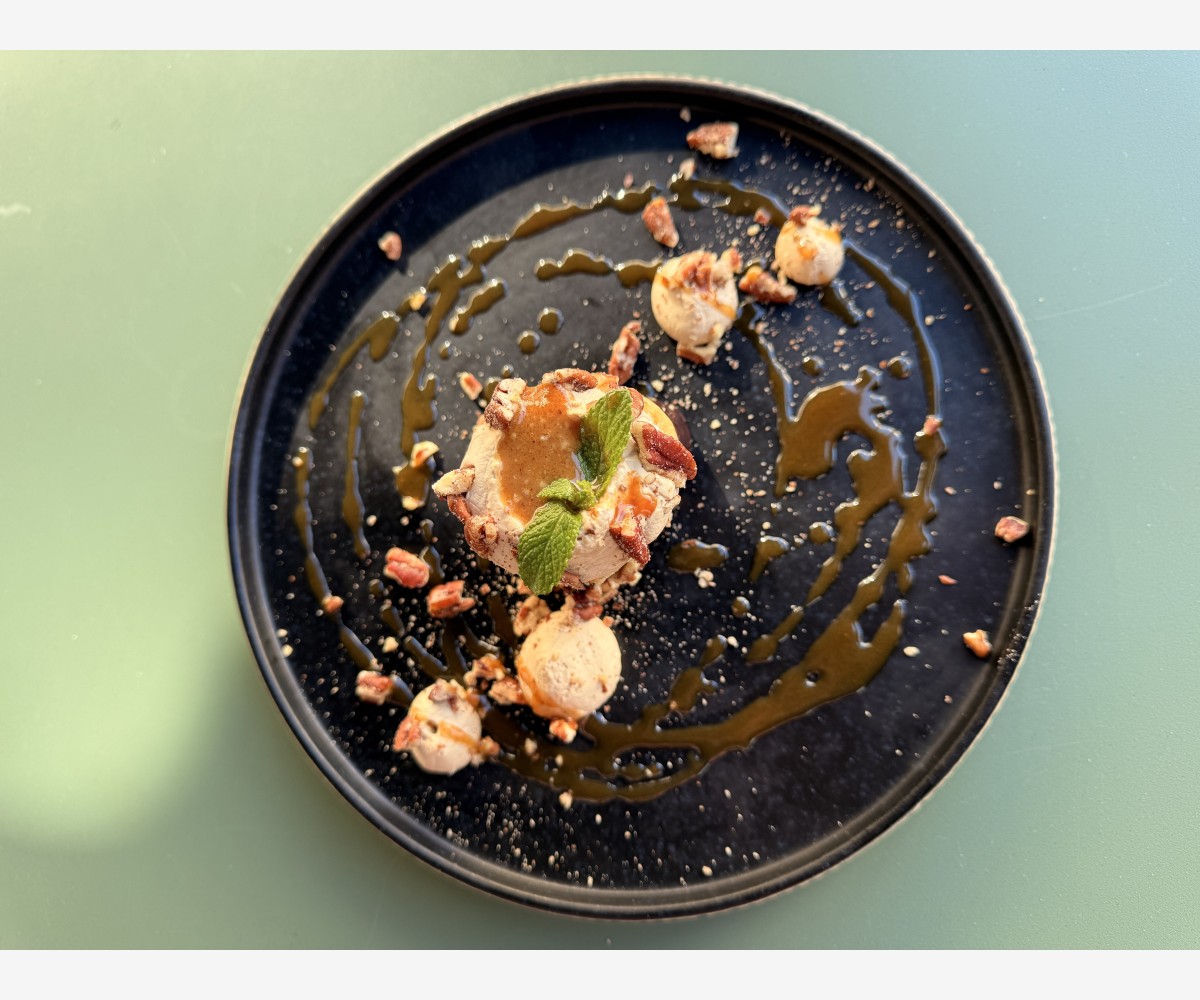 Глазированный купол, карамелизированные яблоки, яблочная вставка, фламбированная с кальвадосом, ореховое печенье и хрустящее шоколадное пралине.