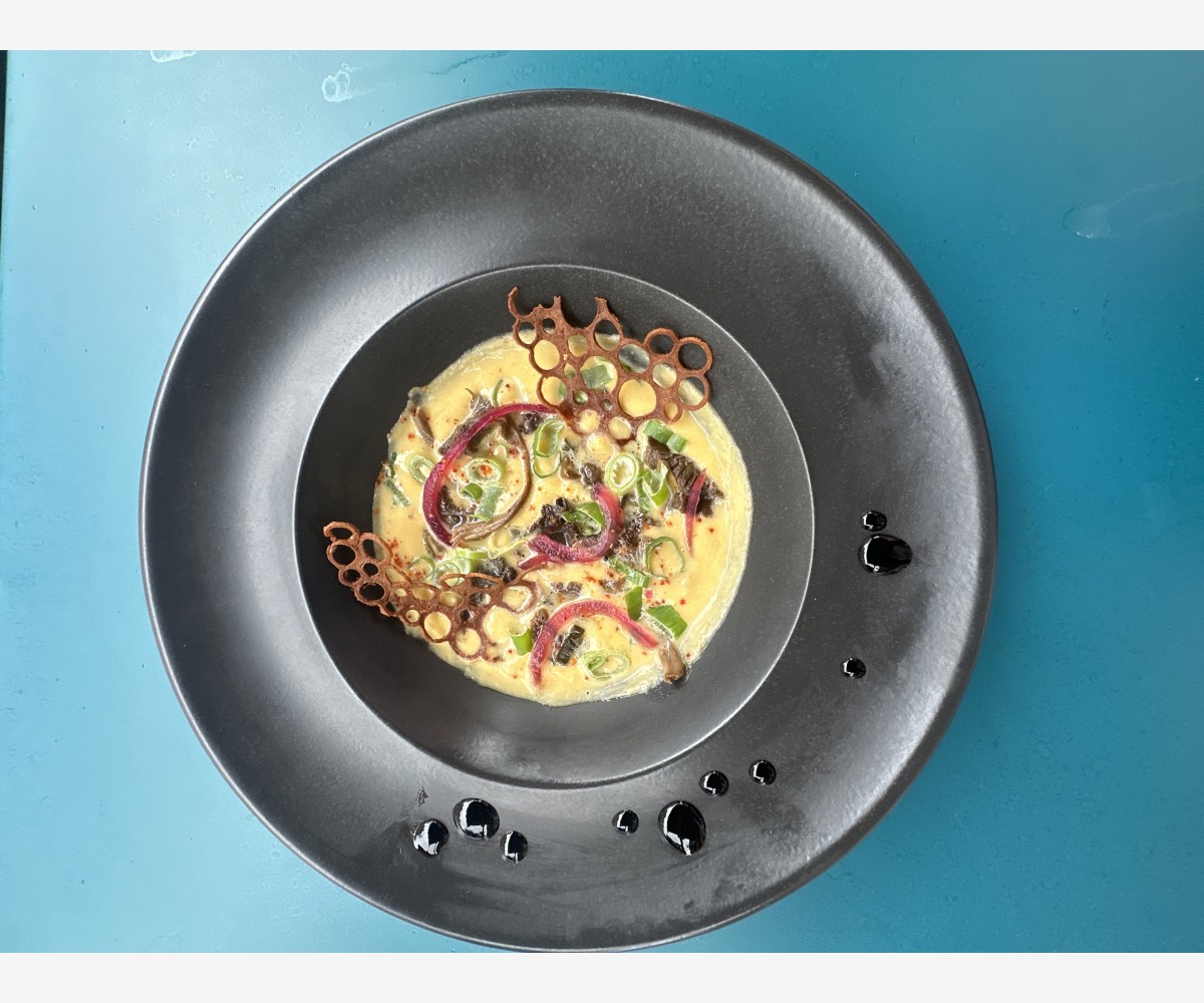 Тыквенный велюте, кусочки каштанов, жареные лисички и кружевная плитка.