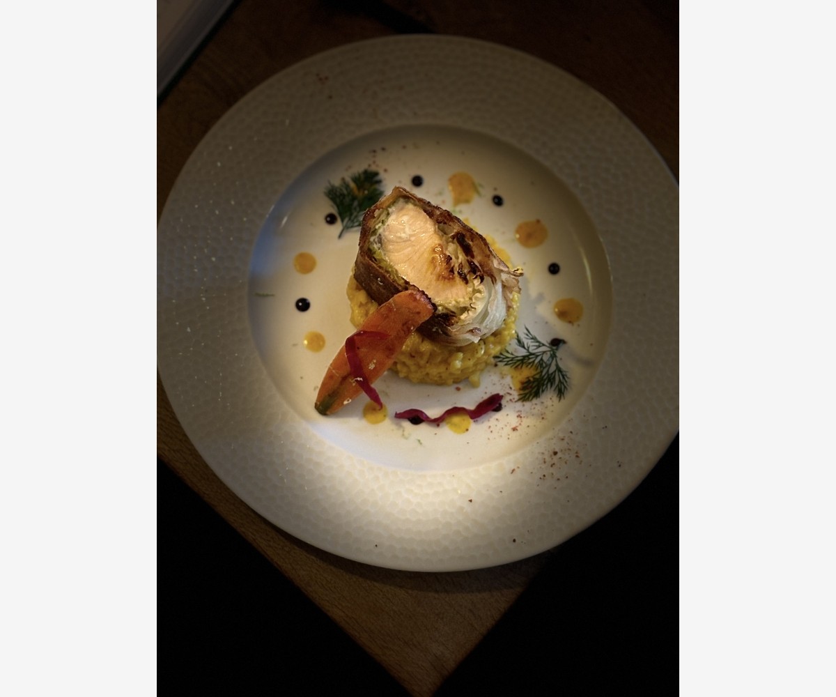 Хрустящий лосось, завернутый в капустные листья, ризотто, соус песто.десерт