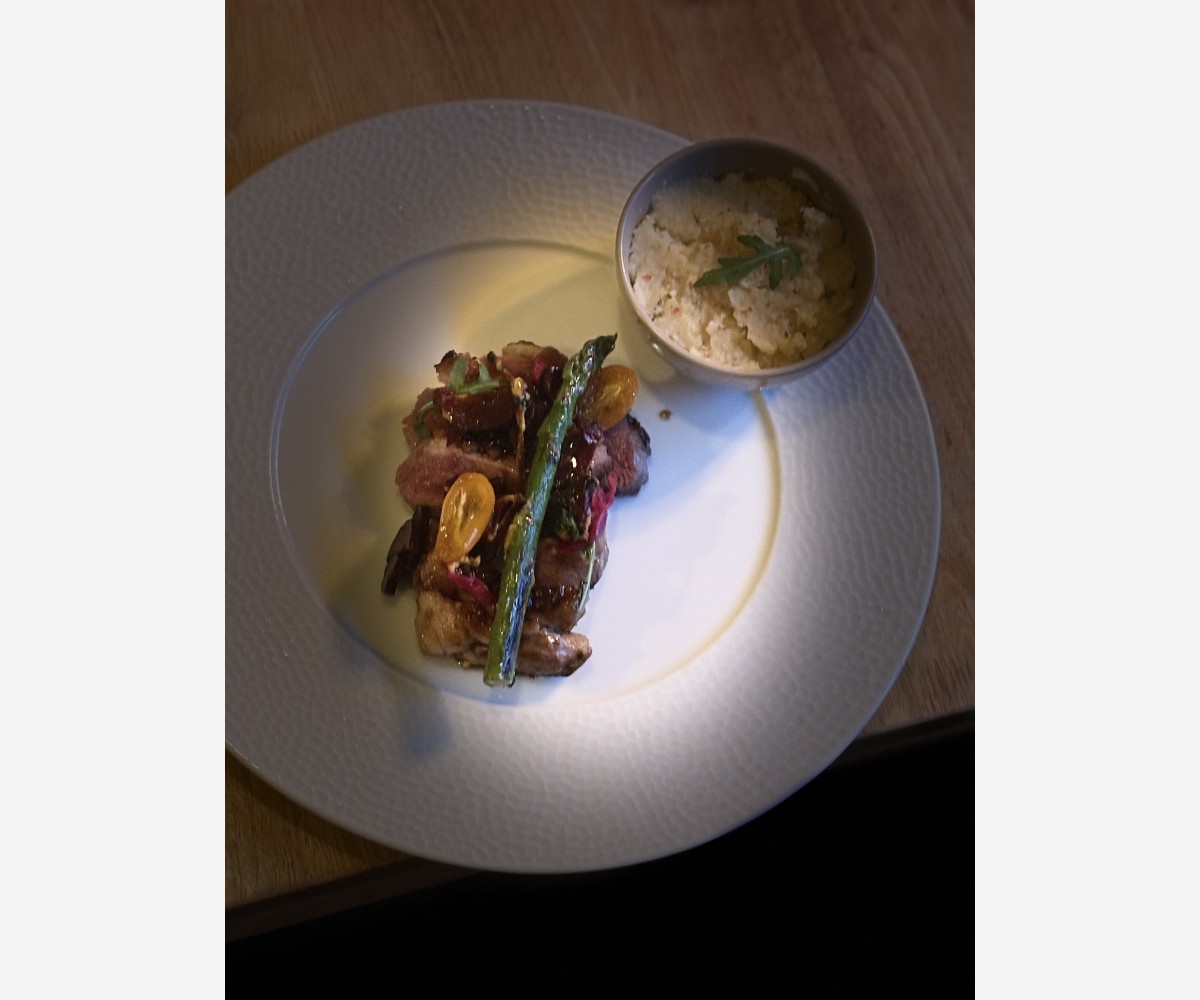 Утиная грудка, чатни из кумквата, картофельное пюре по-нормандски, глазированная морковь.