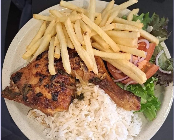 Topside steak with egg on top, garnished with rice, french fries and salad.The meat is served medium rare, if you want it well or rare, please let me know.