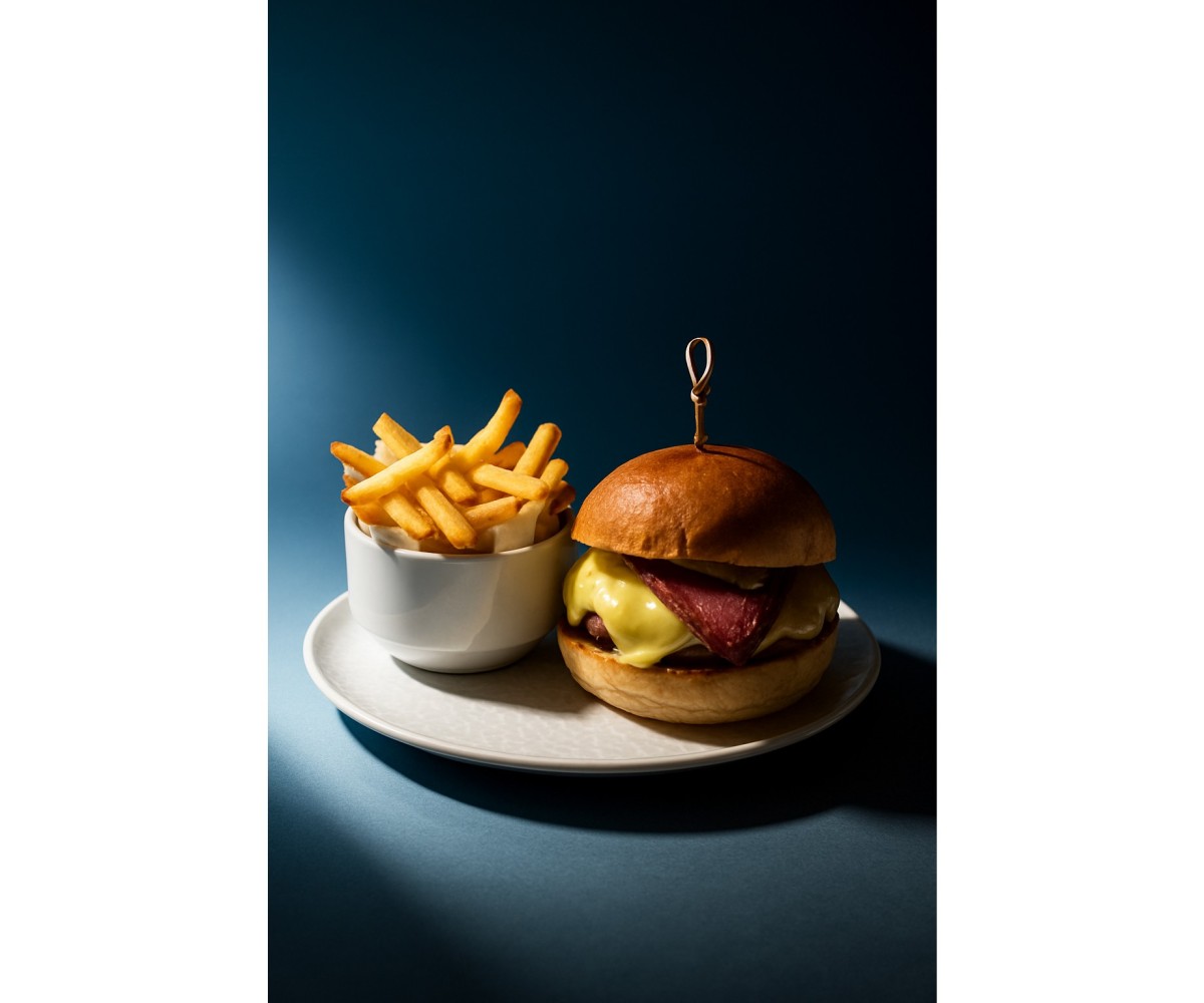 Хлеб-бриошь, тертая говядина, приготовленная в течение 5 часов, соус барбекю, расплавленный эмменталь и карамелизированный лук в сопровождении домашнего картофеля фри.