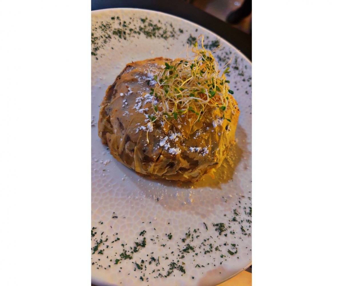 Куриный эскалоп, грибной лесной соус, подается с домашним картофелем фри и зеленым салатом