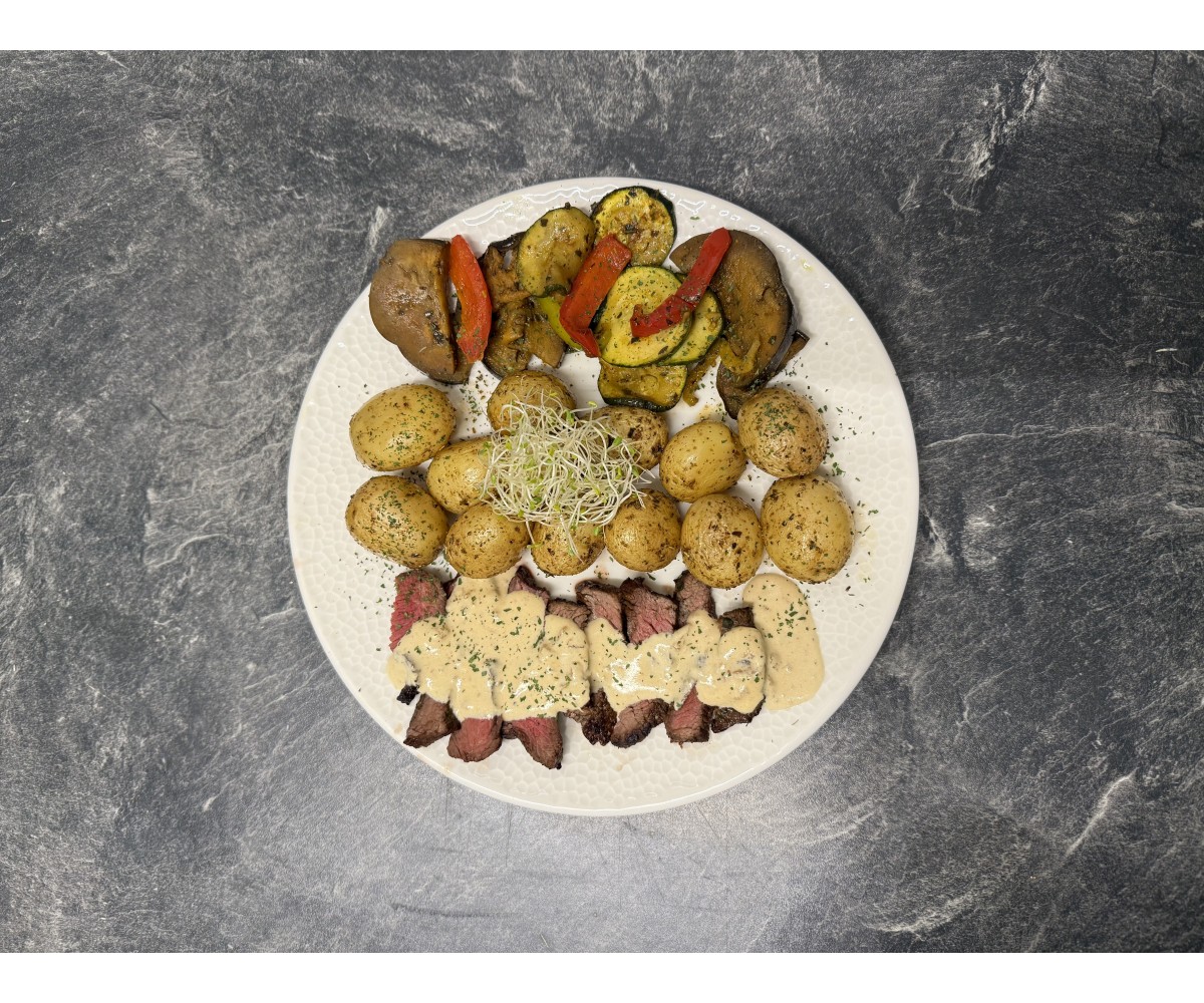 Нарезанная говяжья лопатка, тайский маринад, запеченный картофель и сезонные овощи