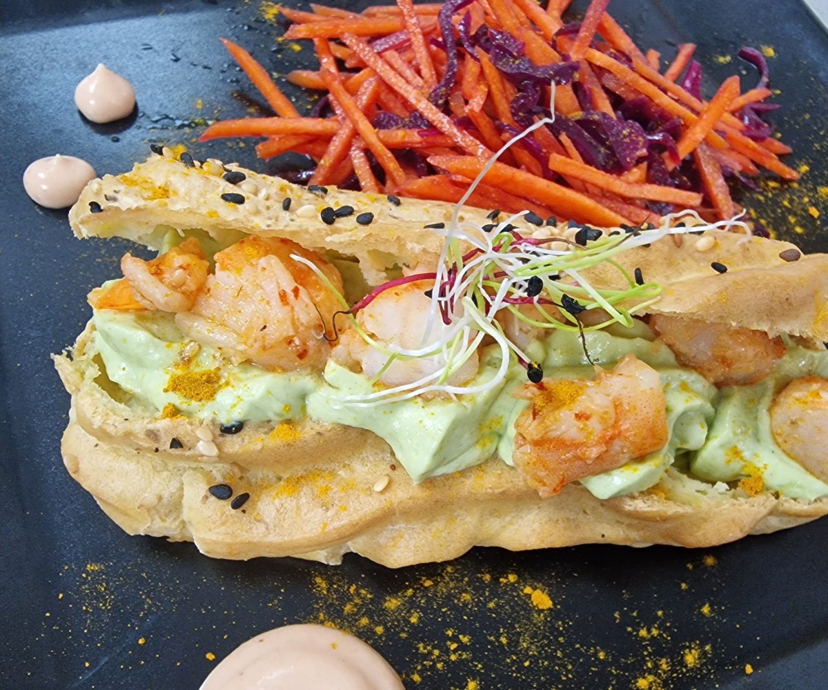 牛油果虾闪电泡芙配埃斯佩莱特胡椒、鸡尾酒酱