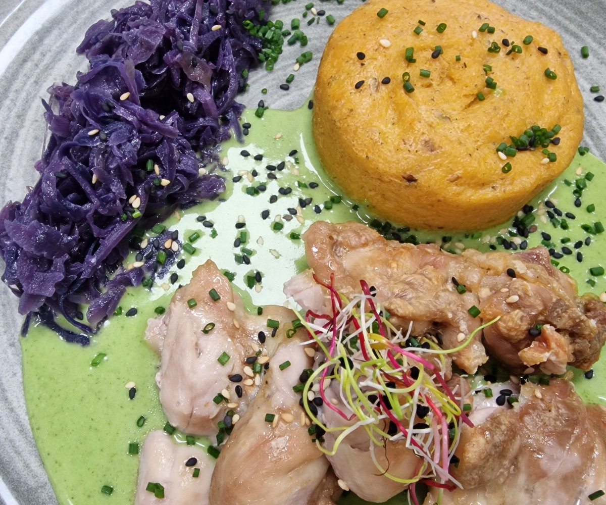 Filets de caille rôtis, jus corsé au miel, pommes dauphines maison, légumes racines au beurre noisetteOrigine FR