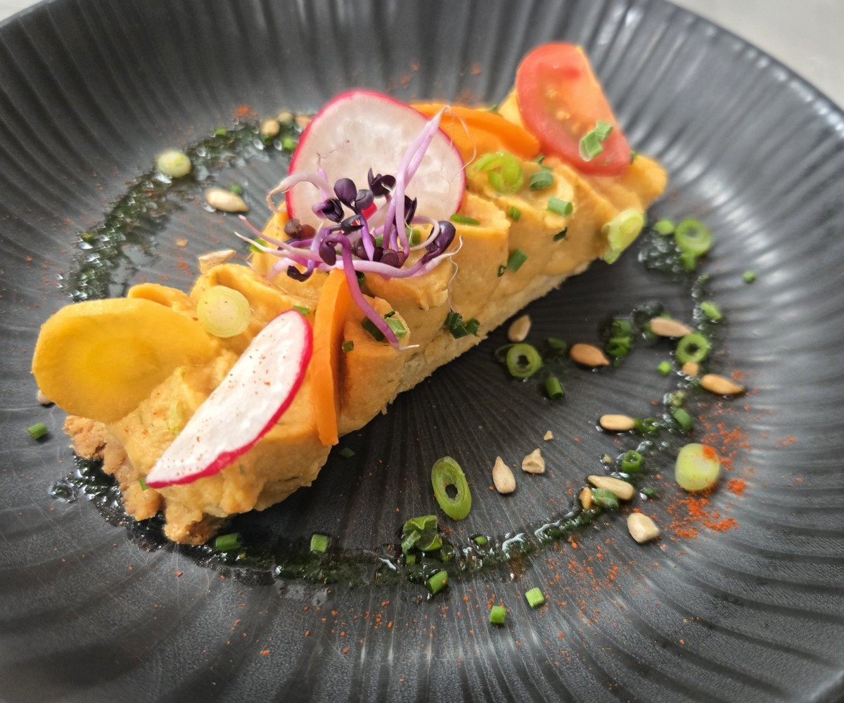 Sablé aux herbes, houmous de lentilles corail et tomates confites, légumes croquants