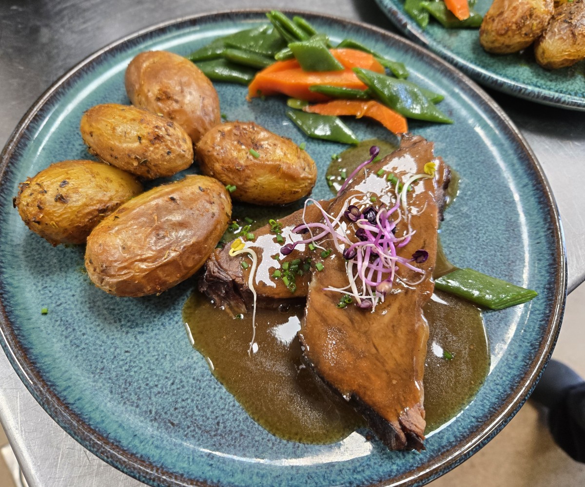 Rosbife de acém preparado por 15 horas, batatas novas assadas, vagem e cenouras caramelizadas.ORIGEM FRANÇA