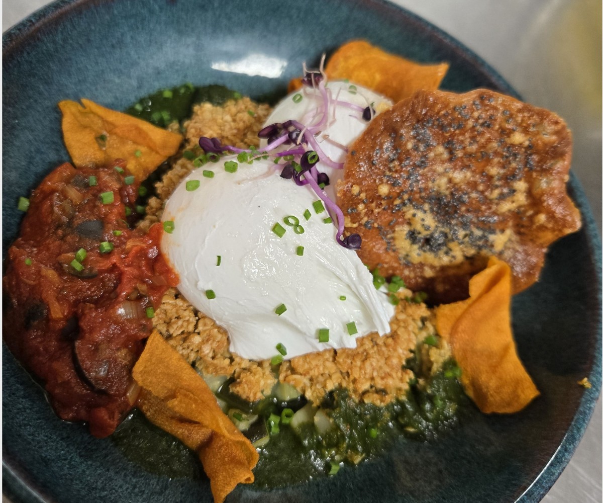 OEufs pochés sur crumble de courgettes au basilic, confit niçois