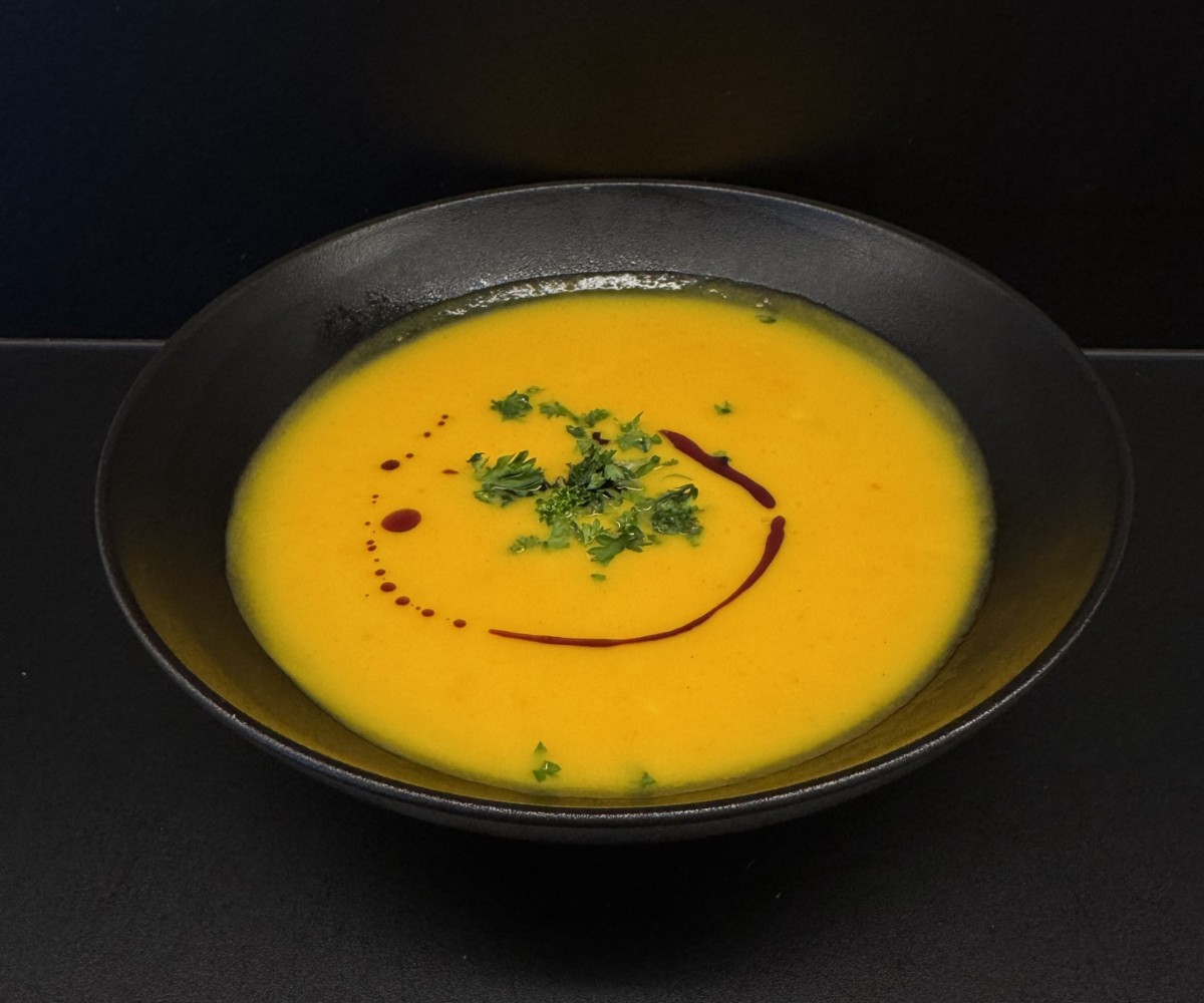 Curry fruttato con mango, patate dolci, verdure asiatiche e anacardi, servito con riso basmati.