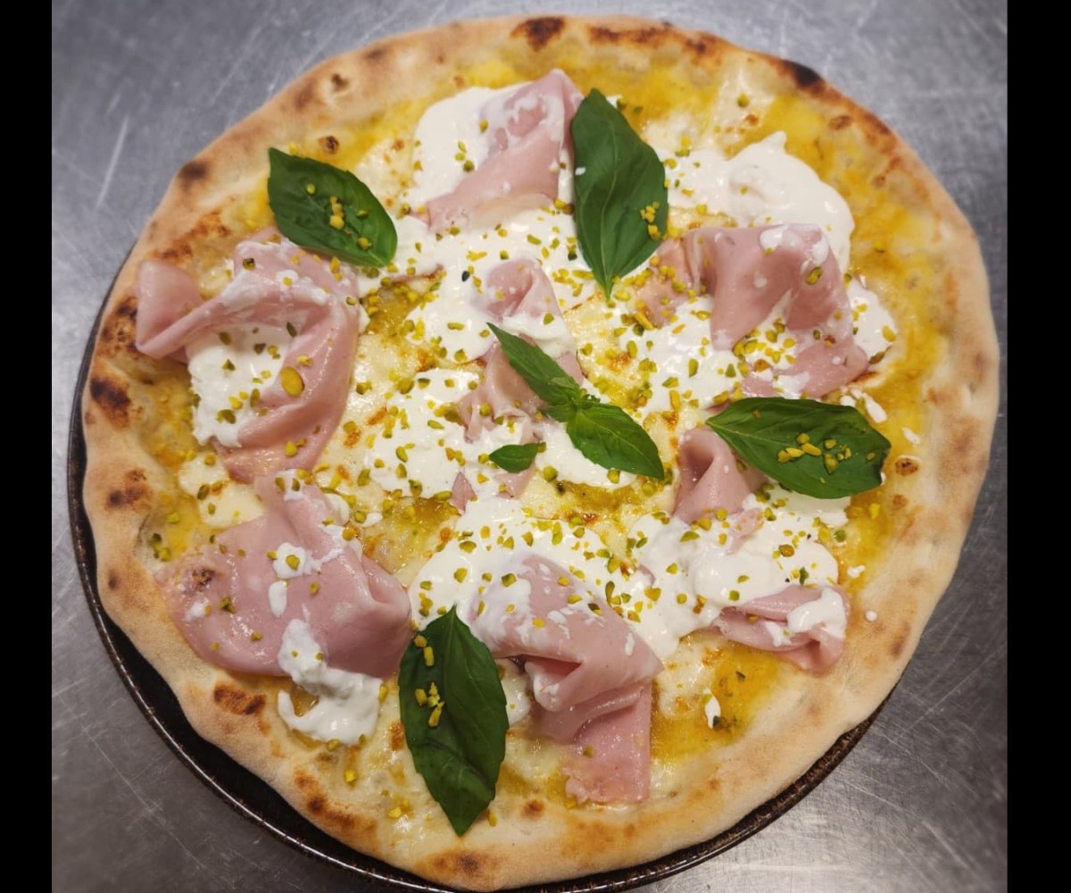 Salsa di pomodoro San Marzano con mozzarella, rucola, prosciutto di Parma e burrata.