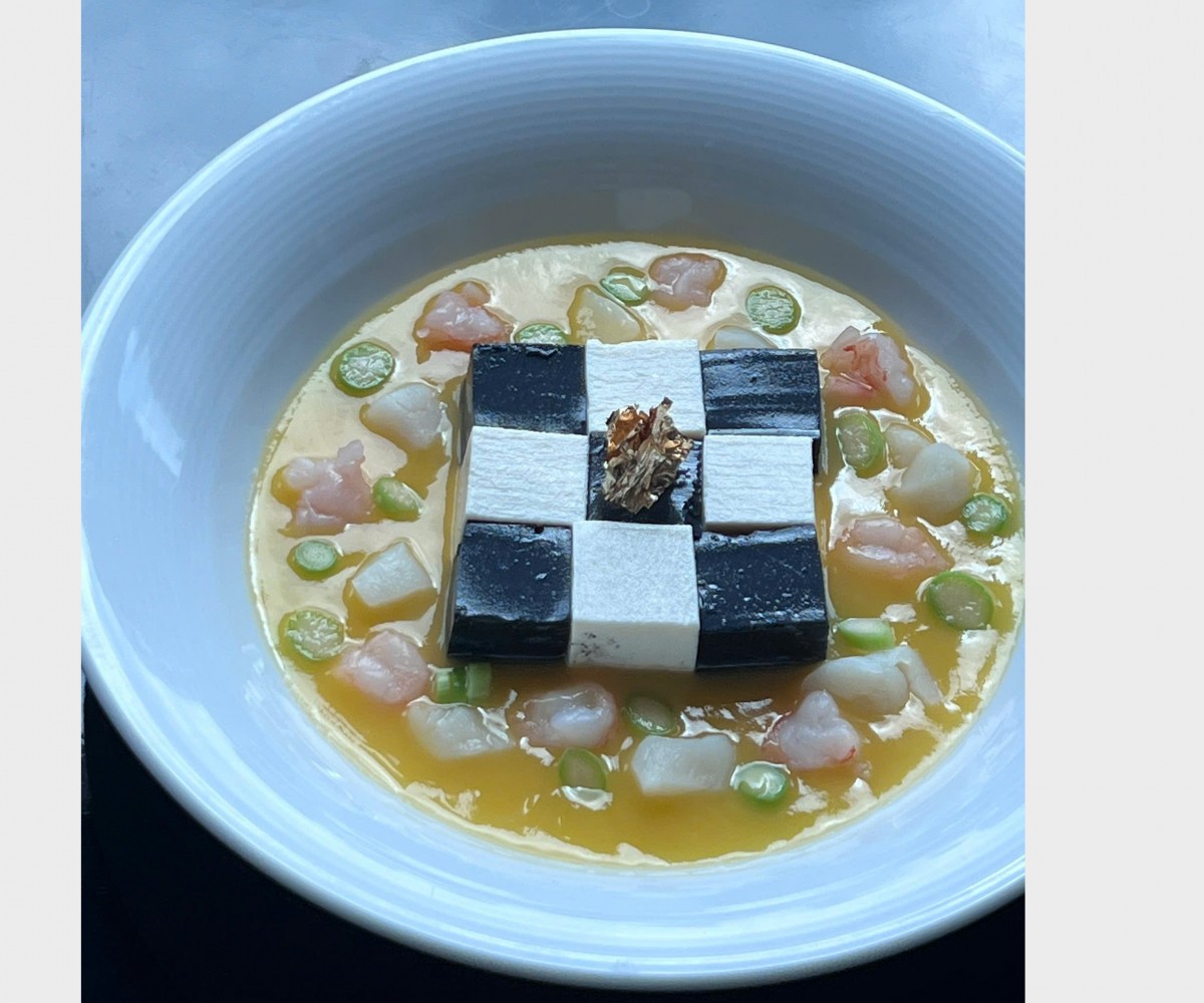 Pele de coalhada de feijão com Yamakurage em molho de gergelim