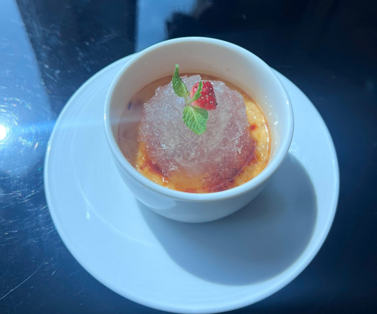 Sopa de carne de caranguejo e vieira seca com melão de inverno picado