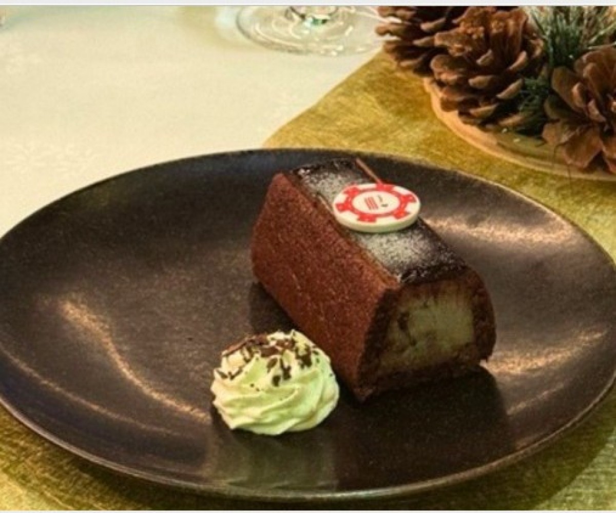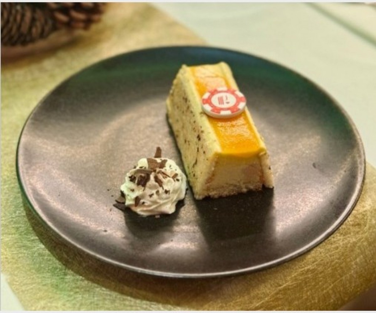 Farandole de mini desserts : Mini tropézienne, Mini carré noisette, Mendiant croustillant chocolat noir, Crème brulée.Et son "trou Normand" sorbet à la pomme et 2cl de Calvados.