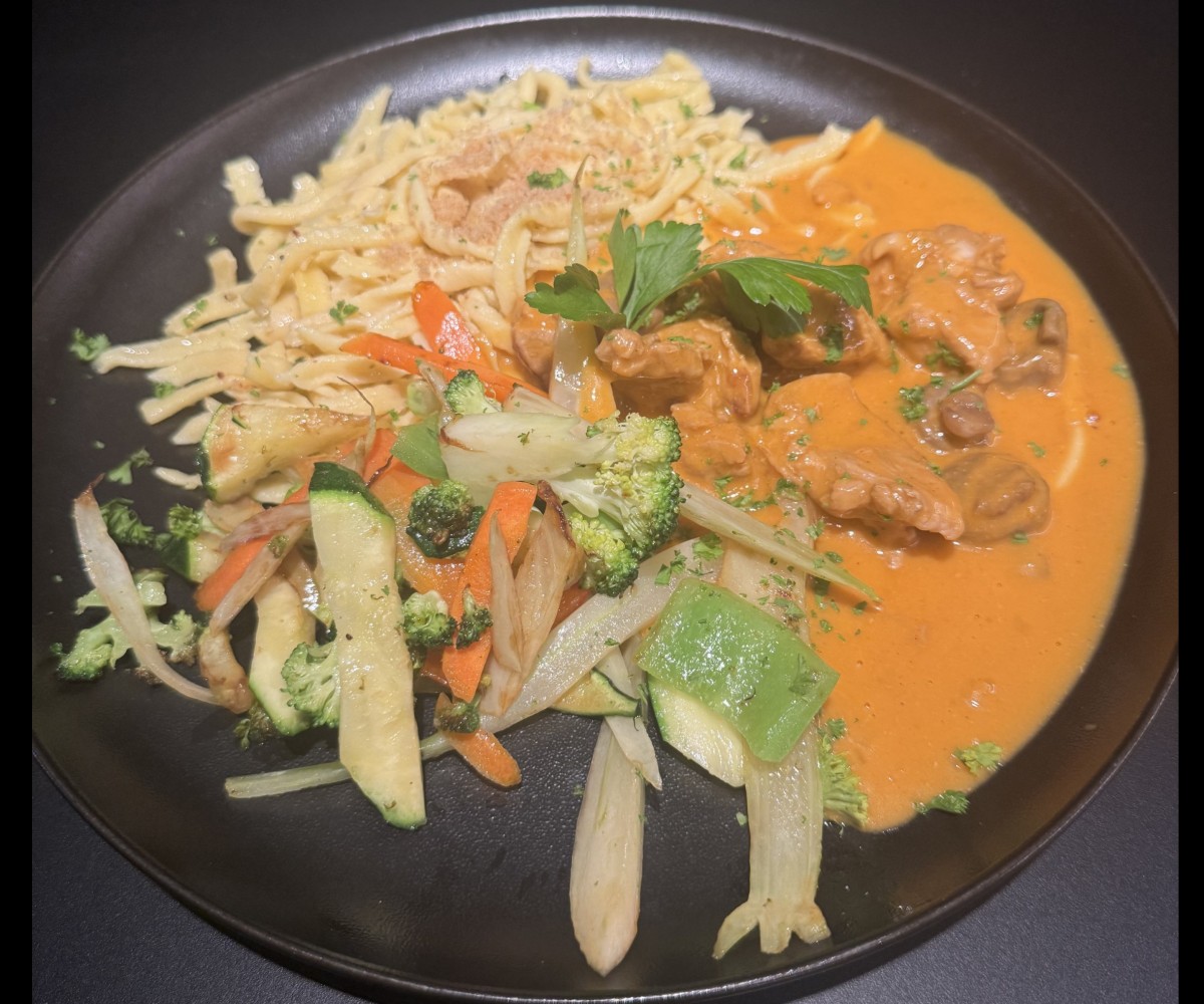Kalbsgulasch in einer Rahmsoße mit Champignons, dazu gebratenes Gemüse und Butterspätzle