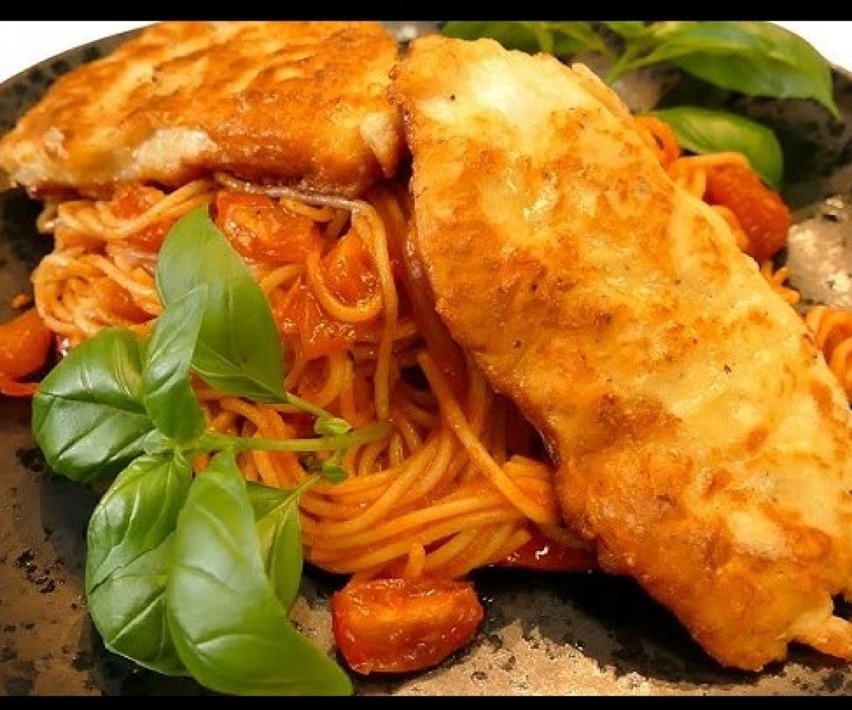 Φιλέτο κοτόπουλου (περίπου 220 γρ.) σε επικάλυψη τυριού και αυγού με φετουτσίνι, σάλτσα ντομάτας και τυρί Grana Padana