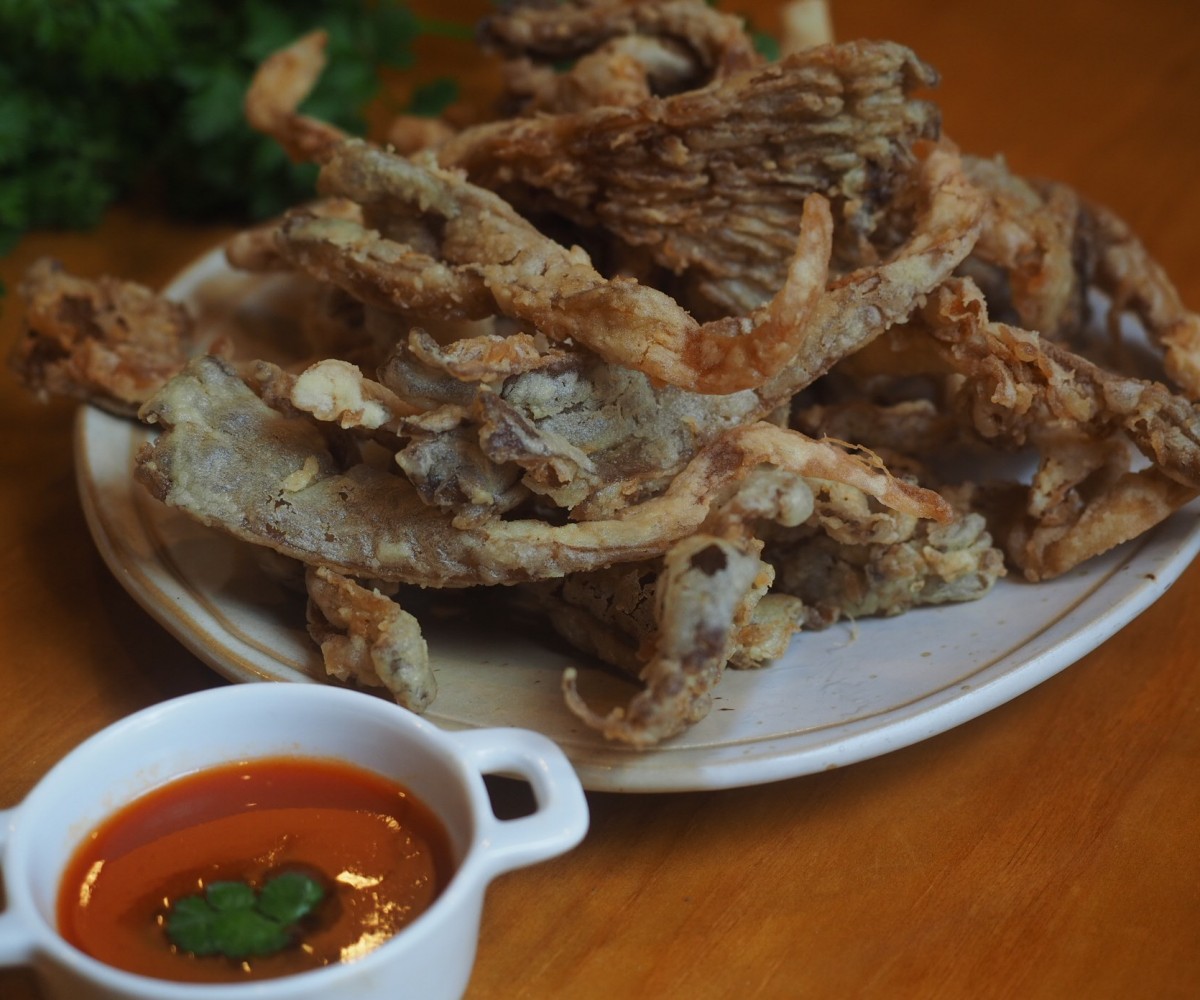 Crujientes setas ostra estilo Indonesia servidas con salsa de soja y tomate.